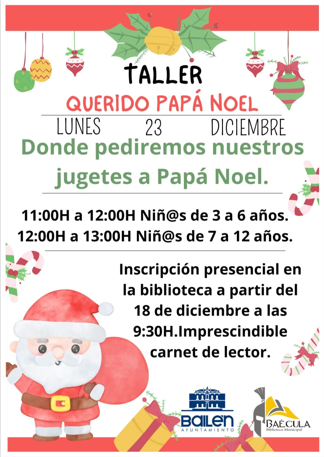 El taller cuenta con aforo limitado, por lo que para la inscripción será necesario el carnet de lector. “Animamos a las familias a participar inscribiendo a sus hijos en este taller; es la mejor manera de ir abriendo boca a la tan esperada llegada de Papá Noel con sus regalos”, concluye la concejal de Cultura.