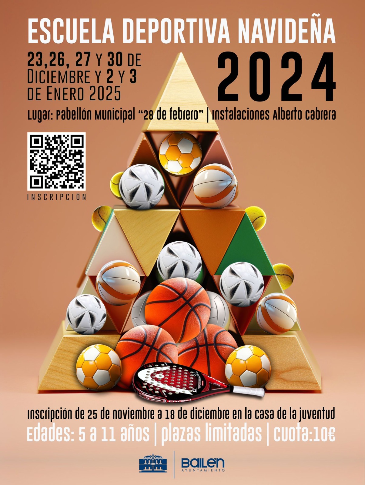 Las familias interesadas en apuntar a sus hijos a la Escuela Deportiva Navideña, que cuenta con plaza limitadas y una cuota de 10 euros, podrán hacerlo desde el 25 de noviembre al 18 de diciembre a través del código QR del cartel anunciador o en la Casa de la Juventud. “Consideramos que esta iniciativa es importante para que nuestros niños no dejen de practicar hábitos tan saludables como el deporte aún en días de fiesta, abriendo el abanico de modalidades deportivas para que conozcan otros deportes distintos a los que suelen practicar, en horario de 9.00 a 13.00 horas”, señala Rodríguez.