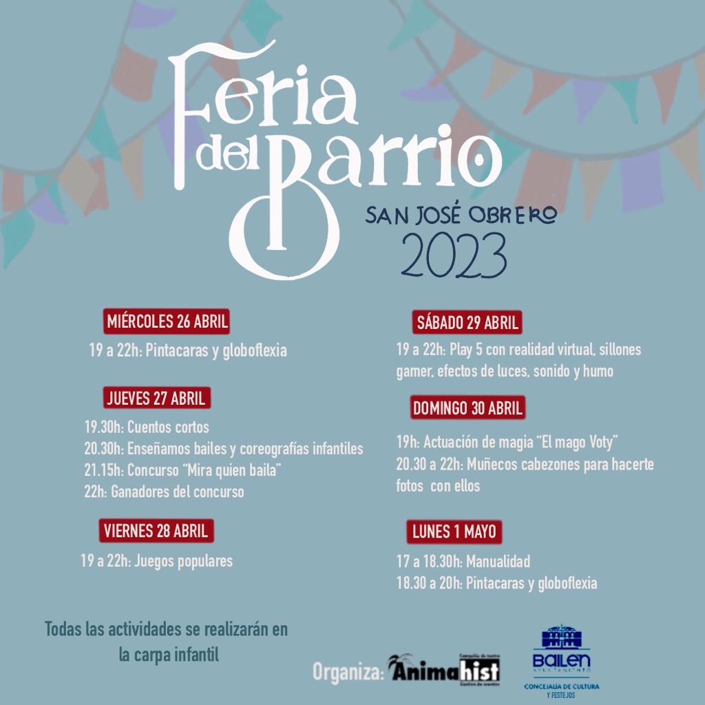 Las actividades para niños, de la Feria del Barrio de San José Obrero, organizadas por las concejalías de Cultura y Festejos y la empresa Animahist, se celebrarán en la carpa infantil, a partir de las siete de la tarde.