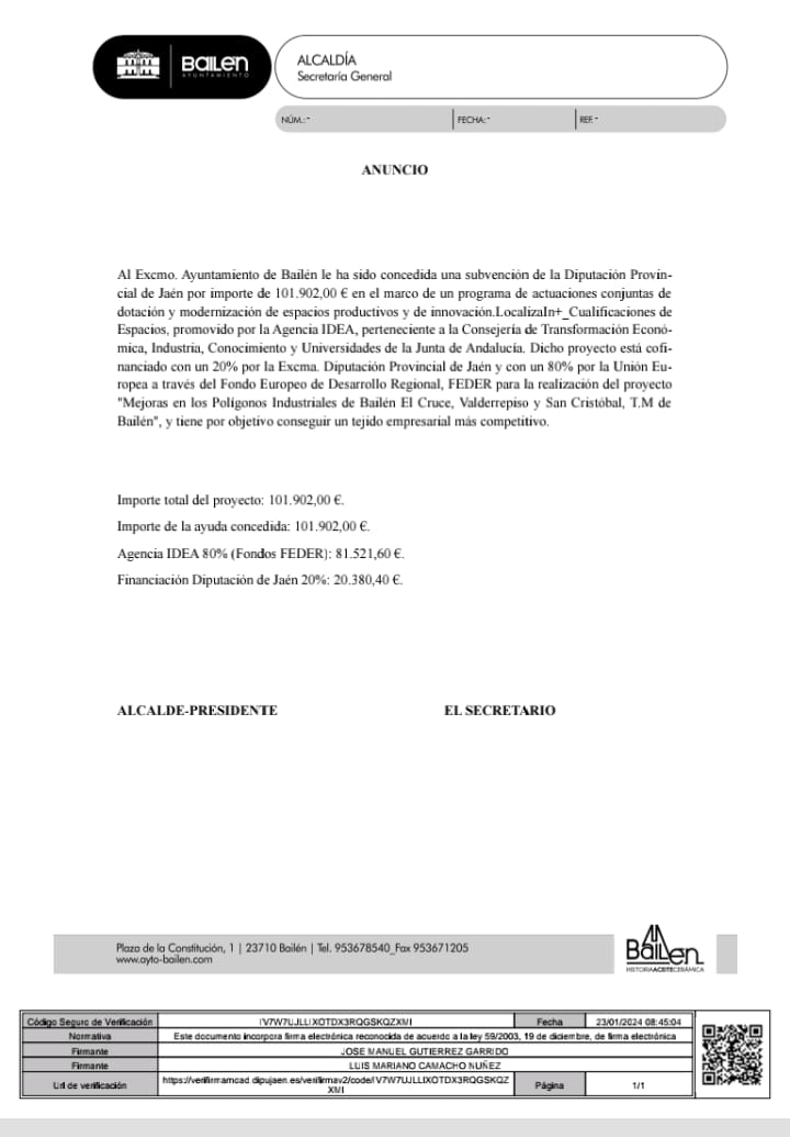 Anuncio Subvención para la mejora en los polígonos industriales de Bailén, El cruce, Valderrepiso y San Cristóbal, T.M. Bailén.