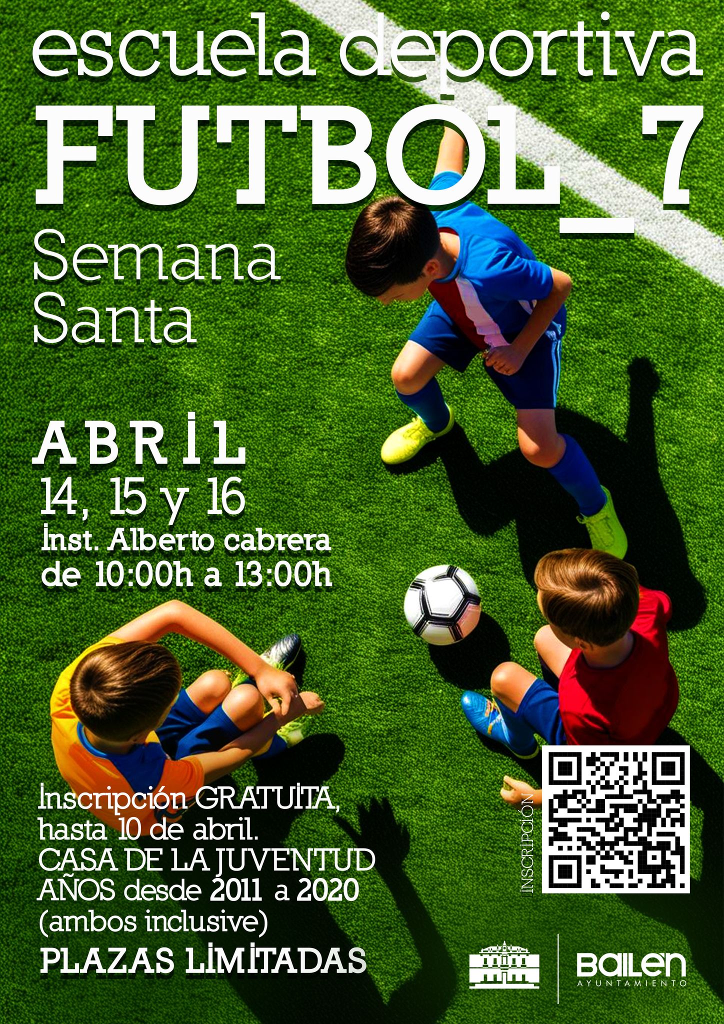 El concejal de Deportes del Ayuntamiento de Bailén, Manuel Rodríguez, ha anunciado la la nueva Escuela Deportiva Fútbol 7 que tendrá lugar durante la Semana Santa los días 14,15 y 16 de abril, de 10.00 a 13.00 en horario de mañana en las instalaciones deportivas Municipales Alberto Cabrera.