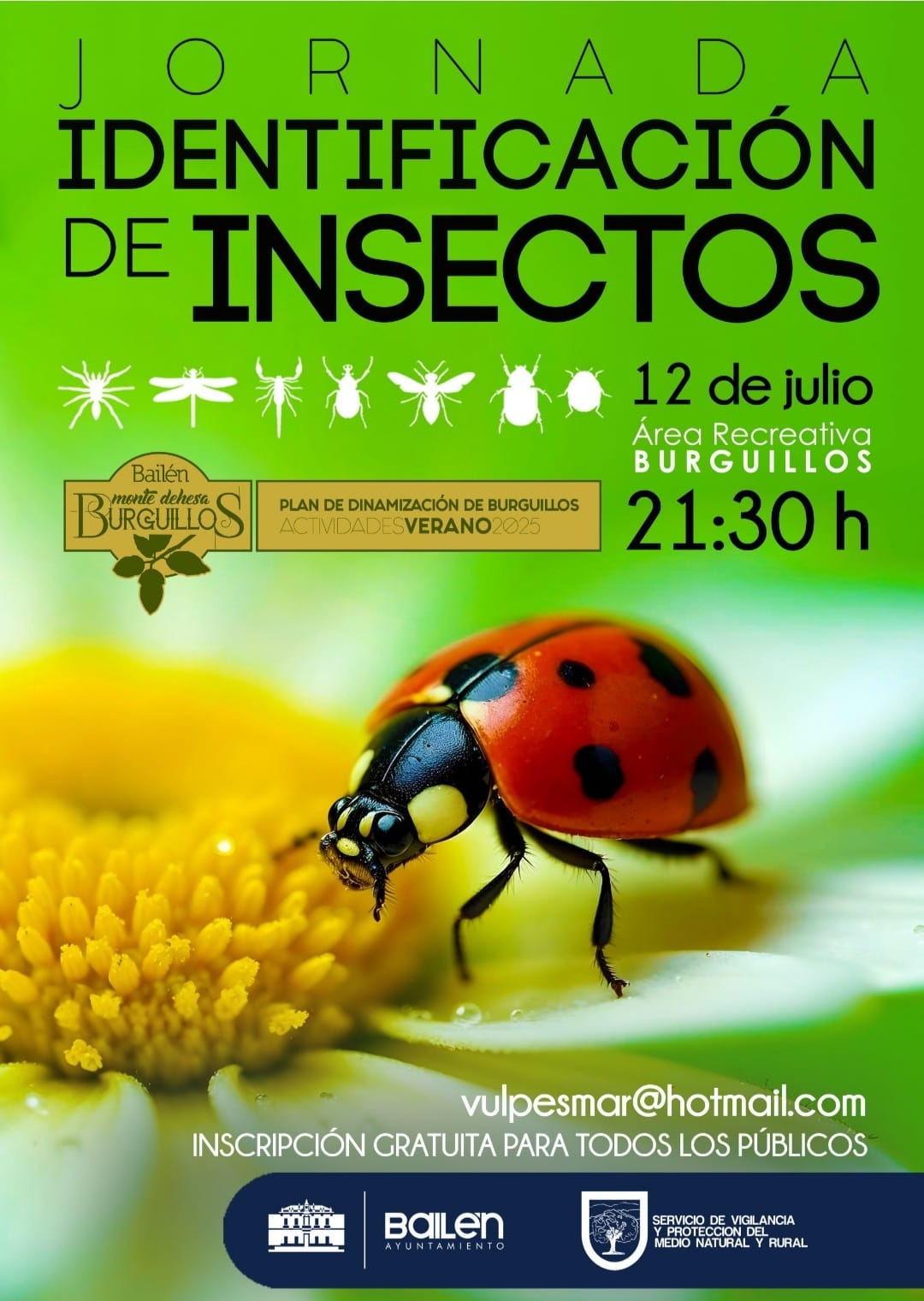 El Área de Medio Ambiente del Ayuntamiento de Bailén, bajo la dirección de María Teresa Risueño, ha organizado en coordinación con el Servicio Municipal de Guardería Rural, una Jornada de Identificación de Insectos. La cita, fechada para el sábado 12 de julio, tendrá lugar en el Área Recreativa Burguillos a las 21.30 horas.