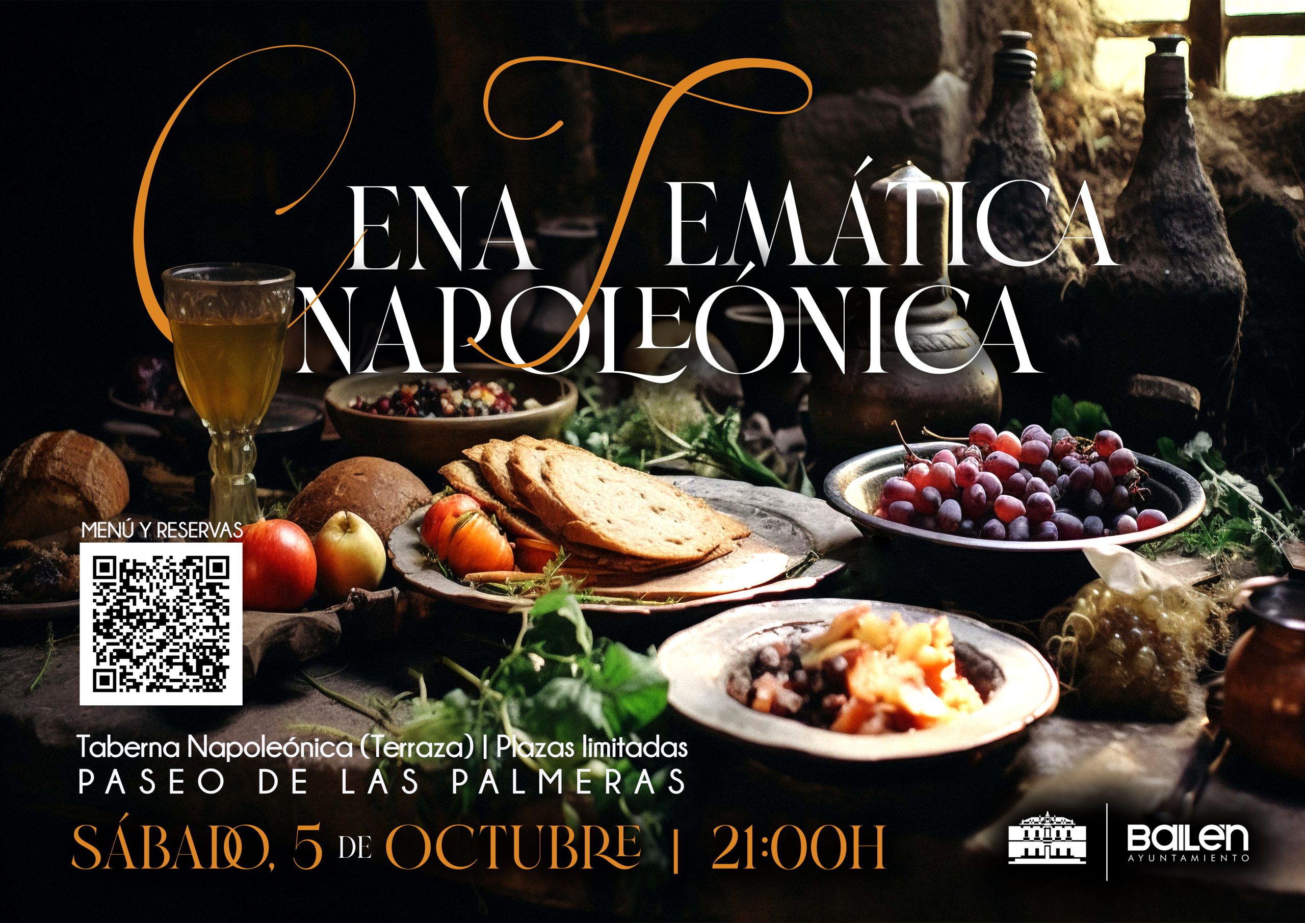 La concejalía de Turismo que dirige Juan Jesús Padilla, está organizando numerosas actividades con motivo de la celebración de la próxima Recreación de la Batalla de Bailén 2024, entre las que se encuentra «La cena temática napoleónica» que tendrá lugar el sábado 5 de octubre a las 21:00 horas en la Taberna Napoleónica ubicada en el Paseo de la Palmeras. Pueden encontrar toda la información en el QR que aparece en el cartel anunciador.