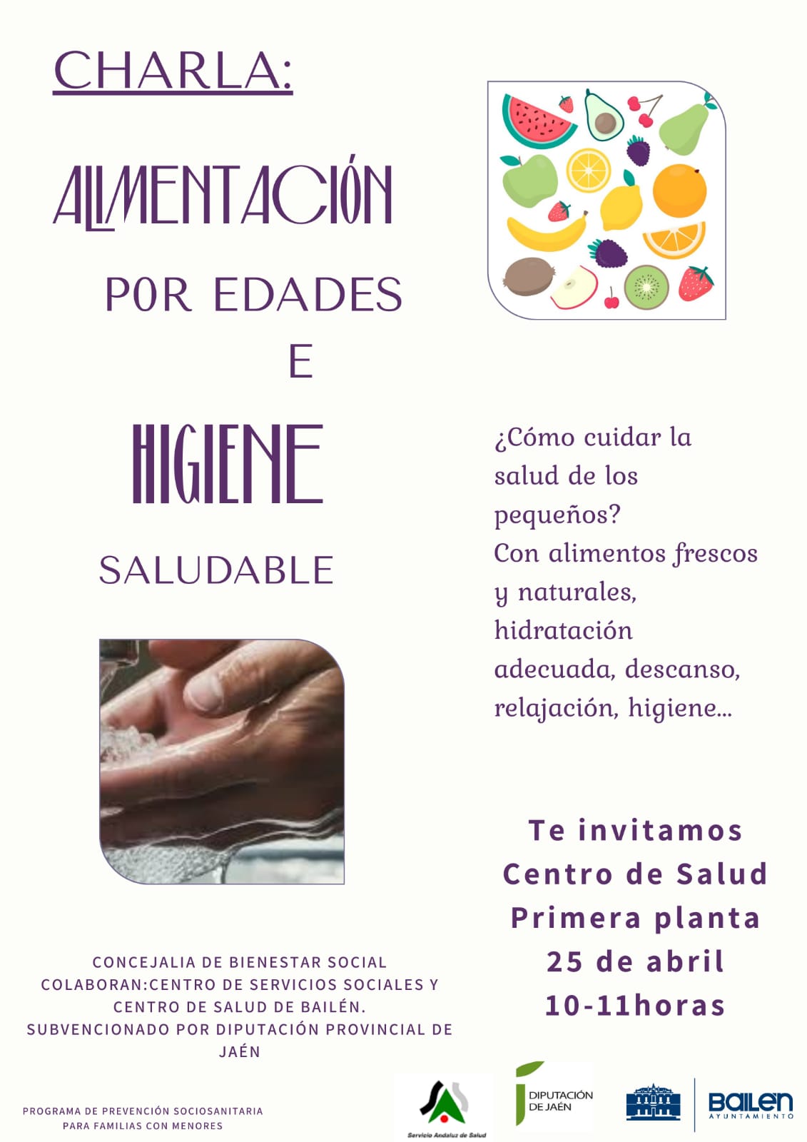 La segunda charla del mes de abril será el jueves 25, a las 10, en el salón de actos de la primera planta del Centro de Salud de Bailén. Será impartida por Maite Lechuga y Laura Arboledas ( Enfermeras del Centro de Salud ), con el título de “Alimentación por edades e higiene saludable” y versará sobre el desarrollo de hábitos saludables en la infancia, tanto en la alimentación, como en la higiene.