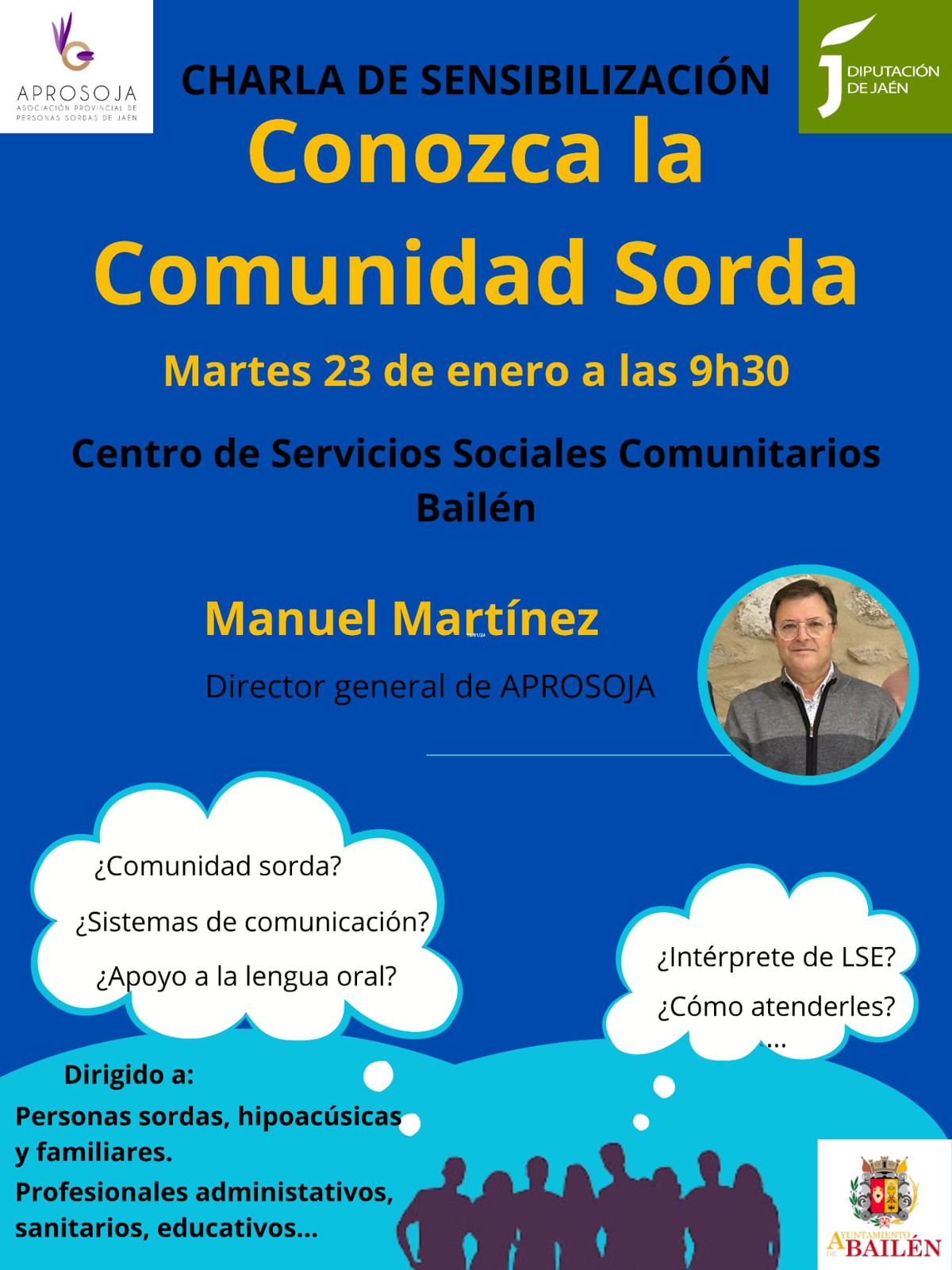 El próximo martes 23 de enero a las 9:30 horas en el Centro de Servicios Sociales de Bailén, se celebrará una charla de sensibilización dirigida a personas sordas, hipo acúsicas y familiares, profesionales administrativos, sanitarios, educativos y cualquier persona interesada. Imparte Manuel Martínez, director de Aprosoja-Asociación Provincial de Personas Sordas de Jaén, encargada de organizar el acto en colaboración con la Diputación de Jaén y la concejalía de Inclusión, Igualdad y Bienestar Social del ayuntamiento de Bailén.
