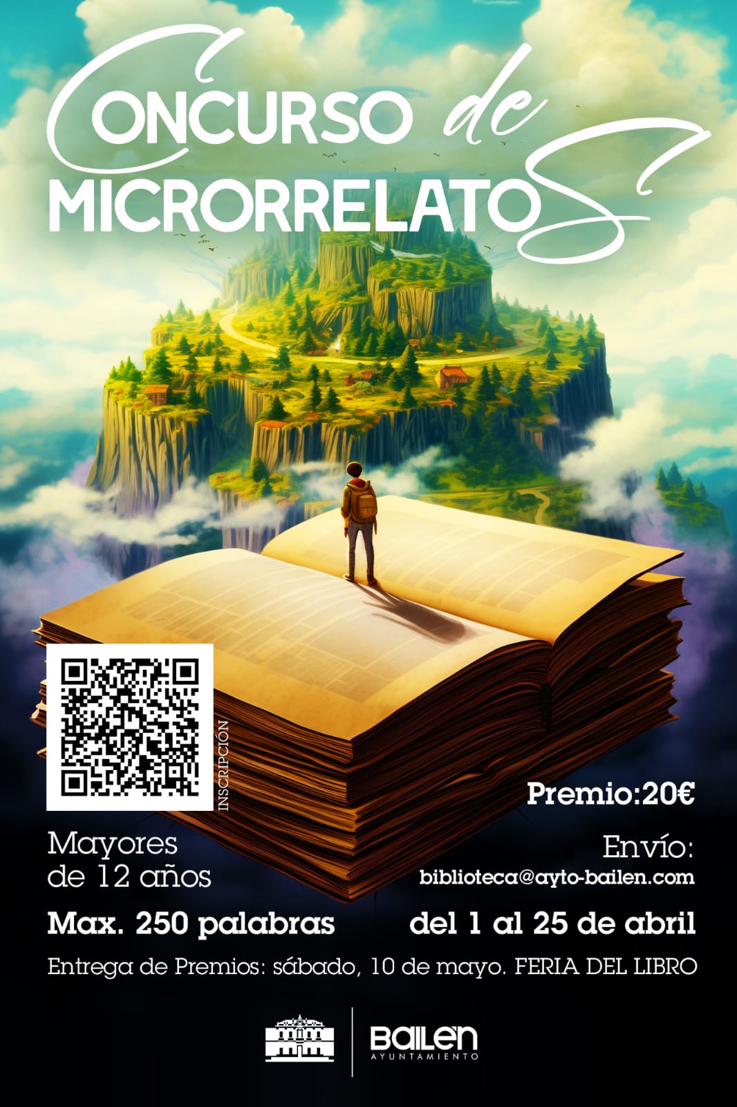 Del 1 al 25 de abril, cada participante podrá mandar como máximo dos microrrelatos distintos al correo electrónico biblioteca@ayto-bailen.com indicando los nombres y apellidos del autor, su edad y facilitando un teléfono de contacto. El concurso finalizará con la entrega de premios el día 10 de mayo por la tarde, durante la celebración de la Feria del Libro.