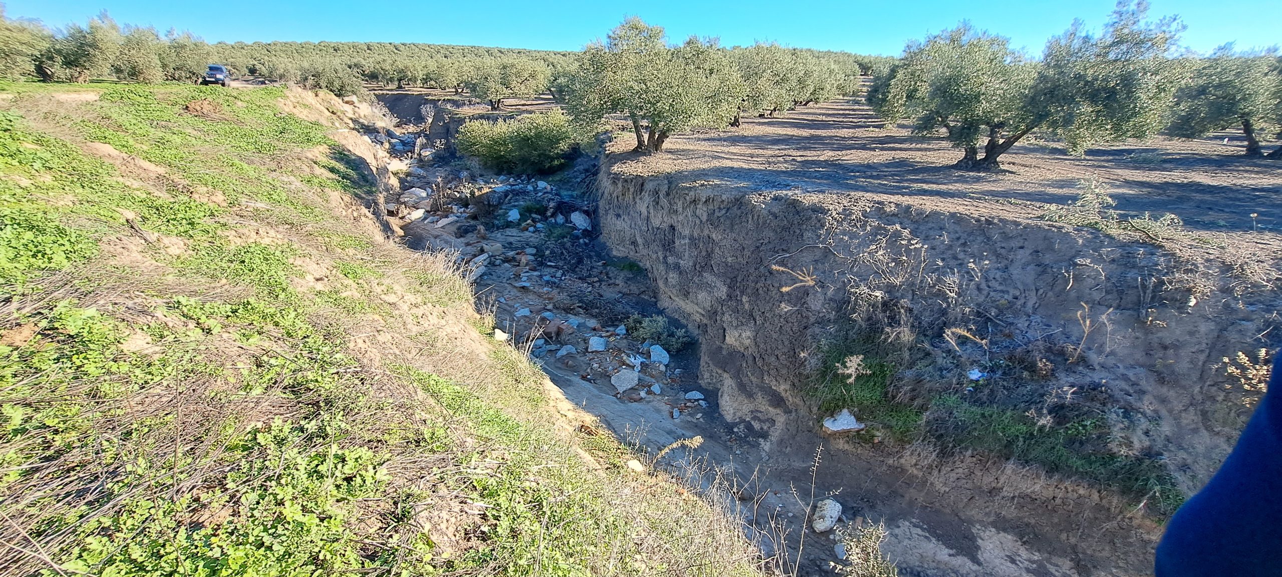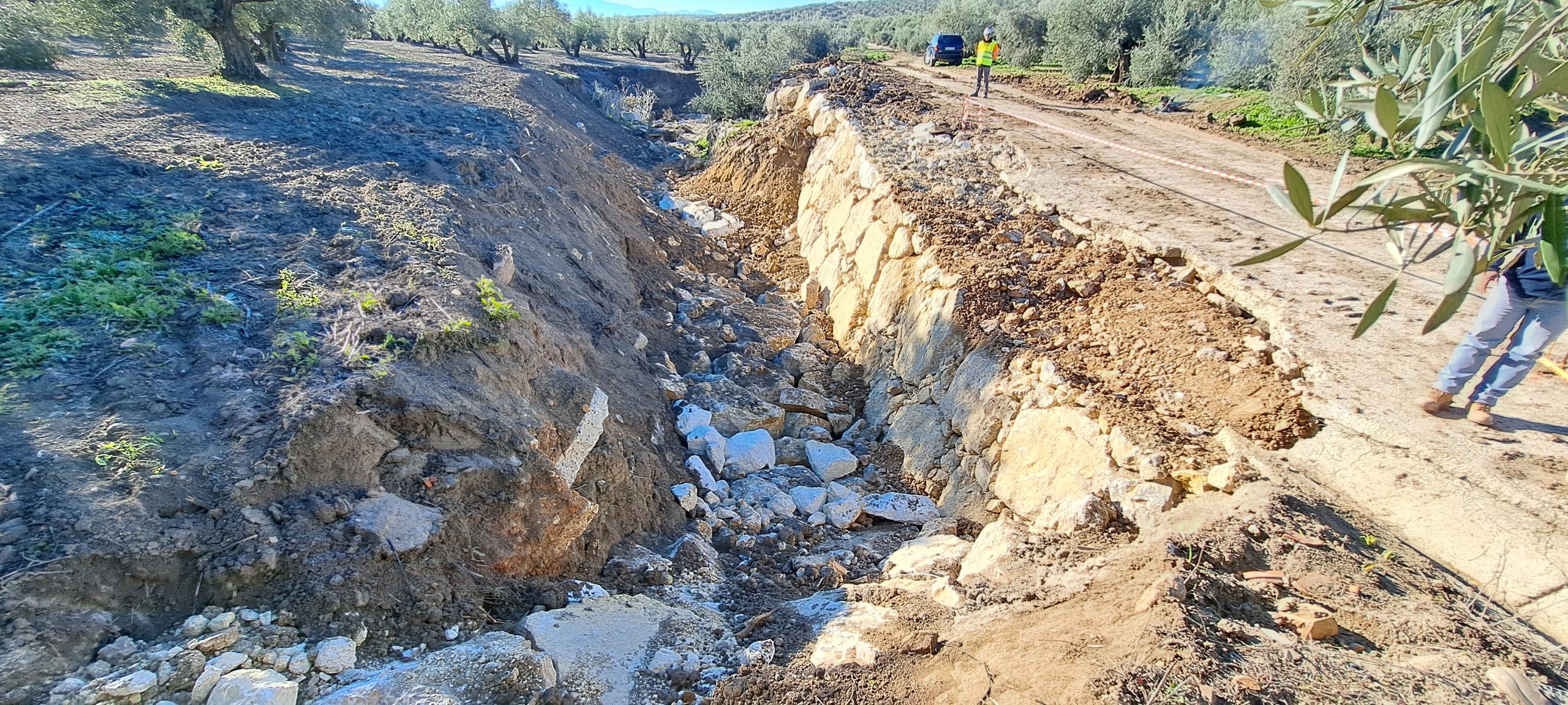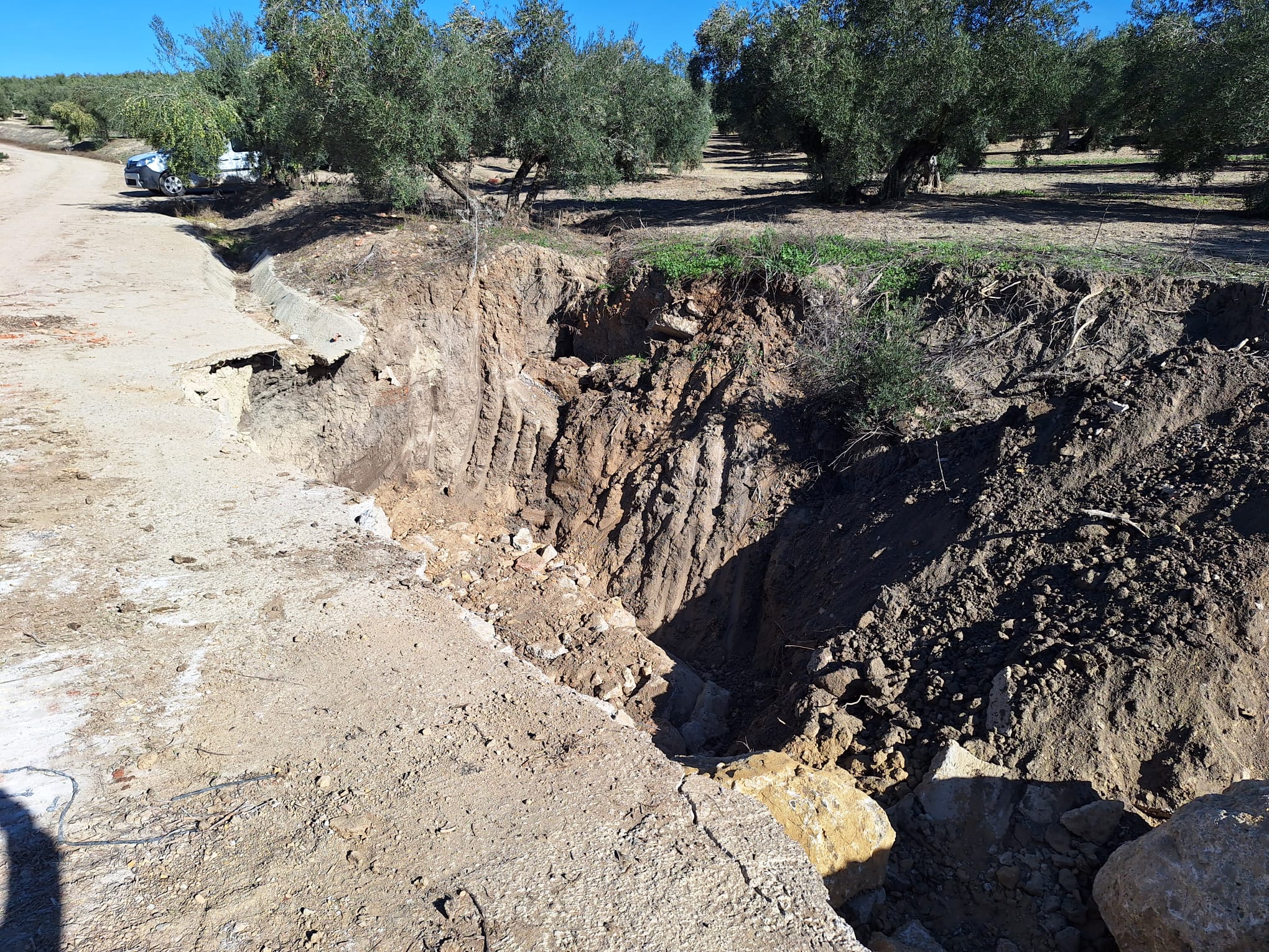 Existían varios tramos del camino que discurren junto a cauces de barrancos. En estos puntos, el agua había erosionado la plataforma del camino, lo que había dado lugar a que se perdiera parte de la misma quedando el firme “en el aire”, con el peligro que suponía para los vehículos que circulaban sobre él. En algunos puntos, la caída del vehículo al barranco supondría una altura de más de 3 m.