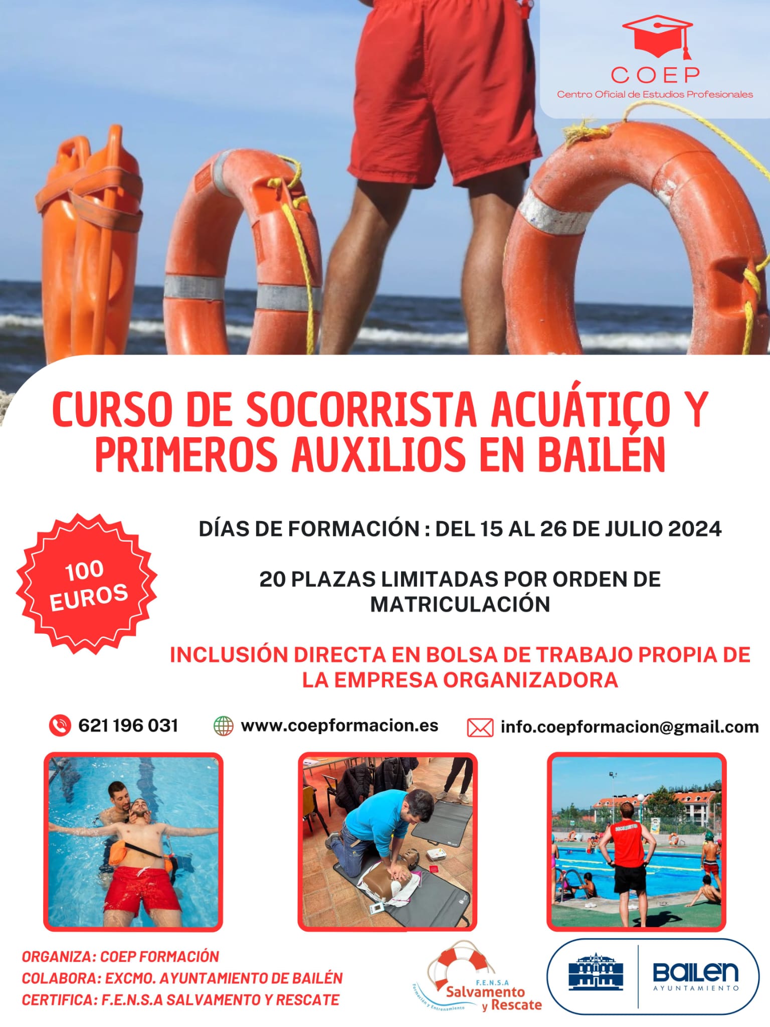 Por otro lado, también se abre plazo de matrícula para el curso de Socorrista Acuático y también para la capacitación de Primeros Auxilios en Bailén. Los días de formación son del 15 al 26 de julio de 2024. Igualmente, las plazas son limitadas y se escogerán a los participantes por orden de matriculación. El precio de esta formación es de 100€.