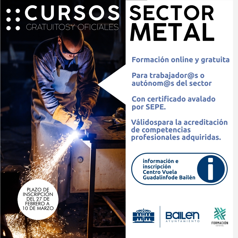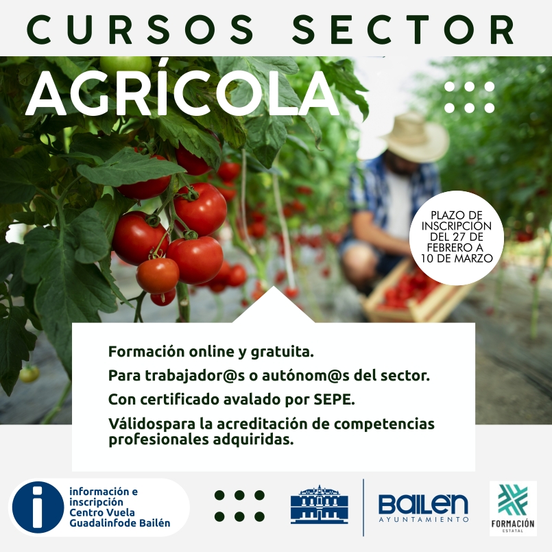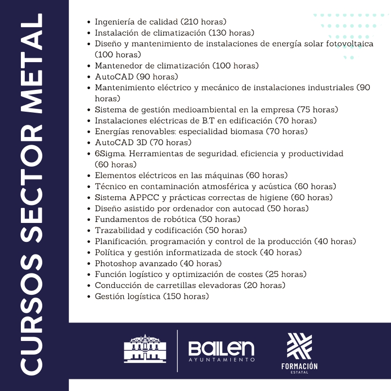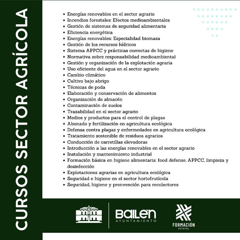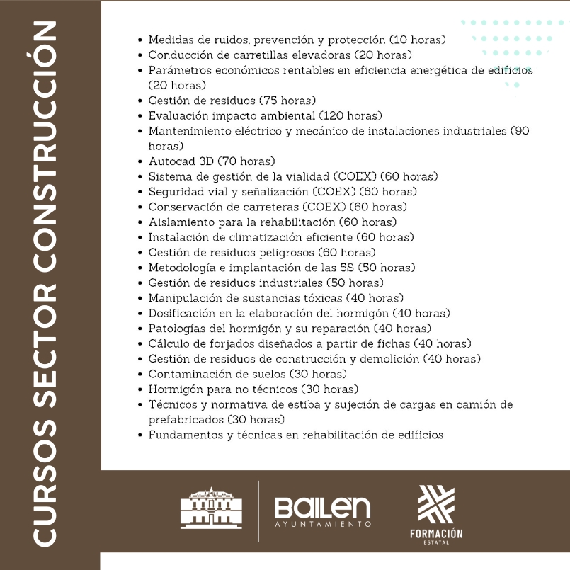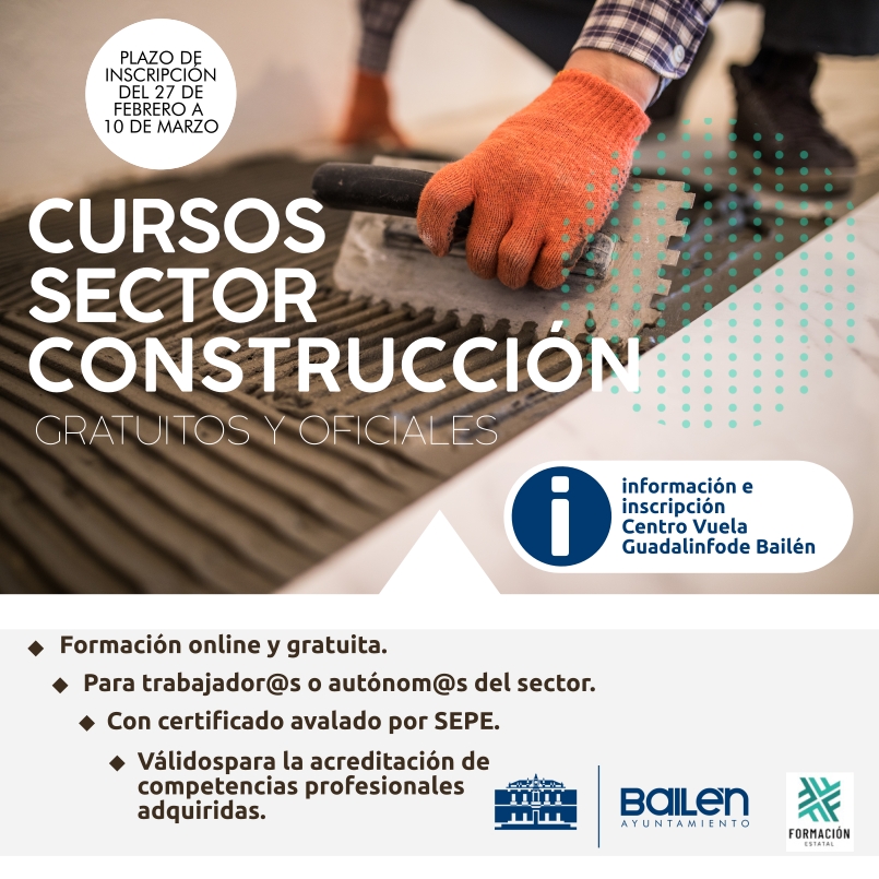El ayuntamiento de Bailen anima a participar en una nueva oferta de cursos de Formación. Se trata de tres cursos online, gratuitos y oficiales para trabajadores o autónomos del sector, con certificado avalado por el Servicio Público de Empelo Estatal (SEPE) y válidos para la acreditación de competencias profesionales.
