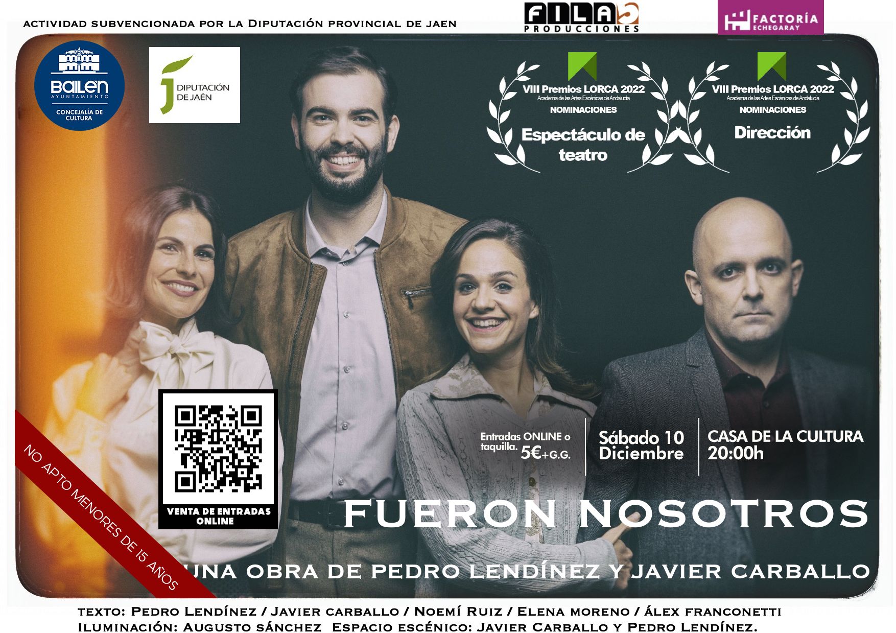 La última apuesta por el momento del bailenense Pedro Lendínez se llama “Fueron nosotros”, fraguada en la Factoría Echegaray de Málaga y con la colaboración de Fila 5 Producciones en la actual gira. “Fueron nosotros” visita Bailén el próximo sábado 10 de diciembre dentro de la programación del Otoño Cultural 2022, contando con la subvención de la Diputación Provincial de Jaén.