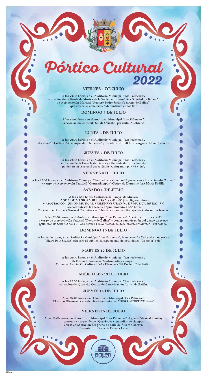 El Pórtico Cultural se inicia el viernes día 1 y se prolongará hasta el día 15. Las distintas actuaciones previstas se realizarán en el Auditorio Municipal “Las Palmeras”, a partir de las diez de la noche, a excepción del Certamen de Bandas de Música, que se desarrollará el sábado 9 de julio en la Plaza del General Castaños, a partir de las nueve y media. La entrada a todas las actuaciones será libre y todas están autorizadas para todos los públicos.