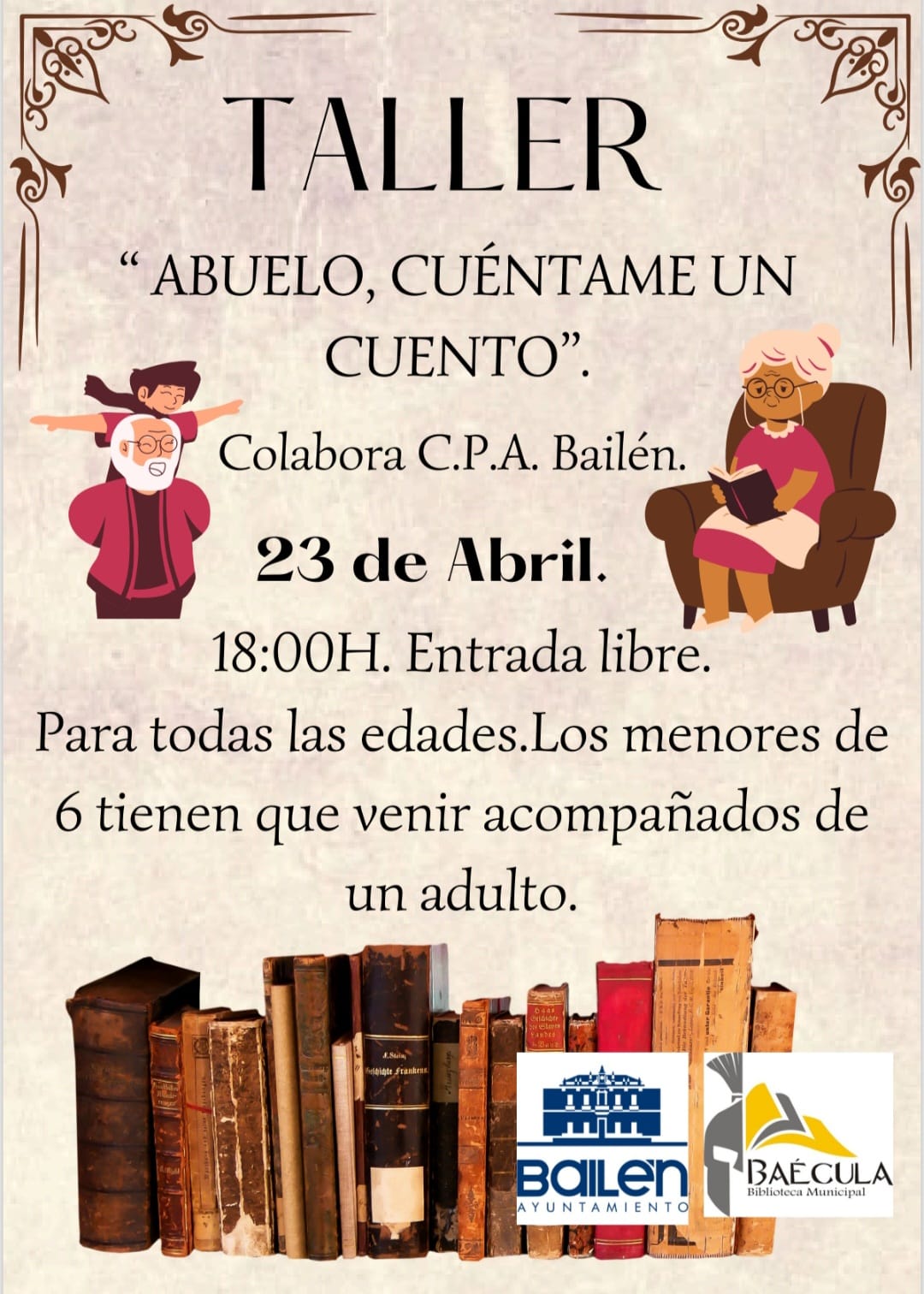 El Área de Cultura del Ayuntamiento de Bailén, a cargo de María Teresa Risueño, ha organizado, en colaboración con el Centro de Participación Activa de Bailén, el taller ‘Abuelo, cuéntame un cuento’. Esta actividad, enmarcada dentro de la programación de la Feria del Libro 2025, tendrá lugar el próximo miércoles, 23 de abril, a las 18.00 horas, en la Biblioteca Municipal Baécula.