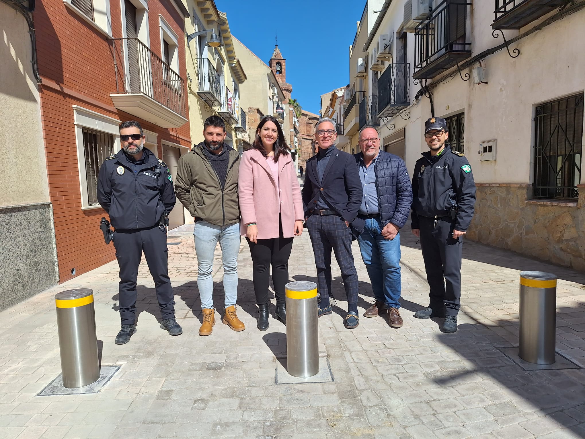 El alcalde del ayuntamiento de Bailén, Luis Mariano Camacho, junto con la concejal de Urbanismo, María Torres, el concejal de Seguridad Ciudadana y Movilidad, Bartolomé Morales, el concejal de Festejos y Deportes, Manuel Rodríguez, y el jefe de la Policía Local, Juan Pedro García, han visitado la calle Iglesia para comprobar el estado final de las obras de intervención de mejora de la accesibilidad y seguridad ciudadana.