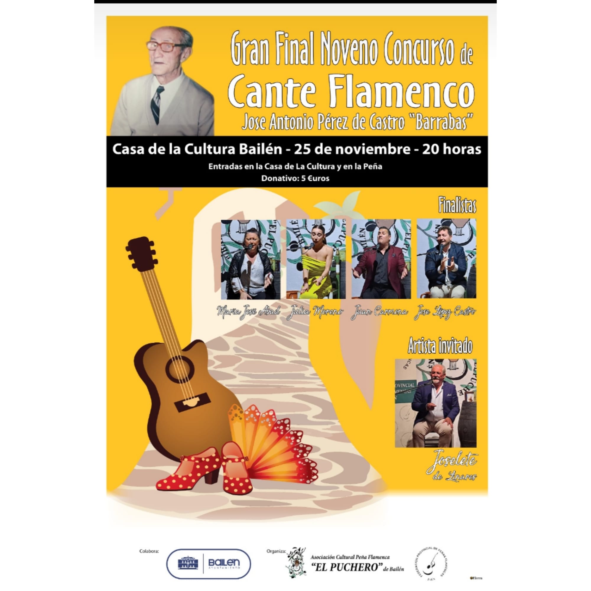 El próximo sábado 25 de noviembre a las 20:00 horas, El salón de Actos de la Casa de la Cultura acogerá la Gran final del IX Concurso de Cante Flamenco José Antonio Pérez de Castro “Barrabás”, organizada por la Asociación Cultural Peña Flamenca “El puchero” de Bailén y la Federación Provincial de Peñas Flamencas de Jaén con la colaboración de la concejalía de Cultura, del Ayuntamiento de Bailén, a cargo de María Teresa Risueño.