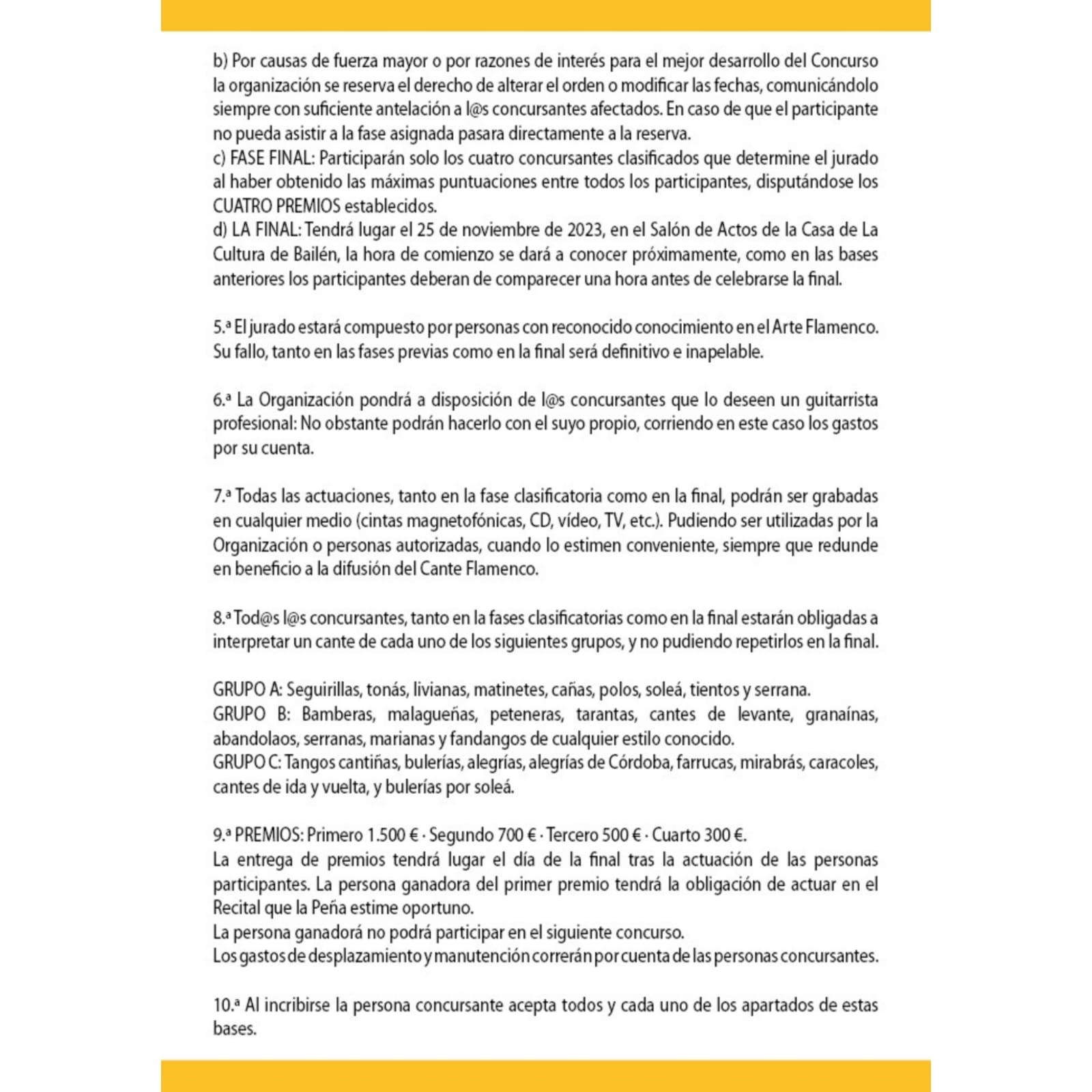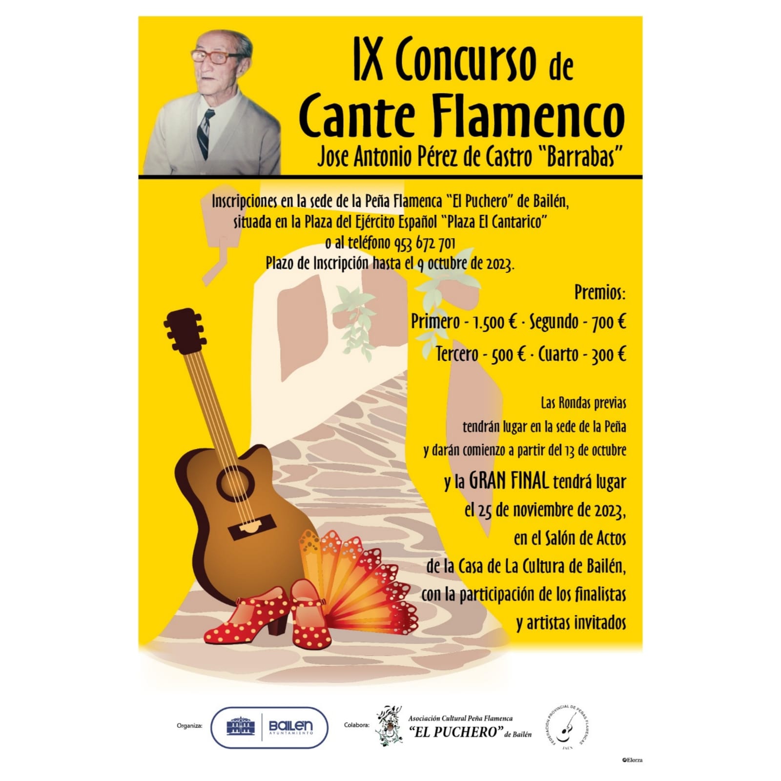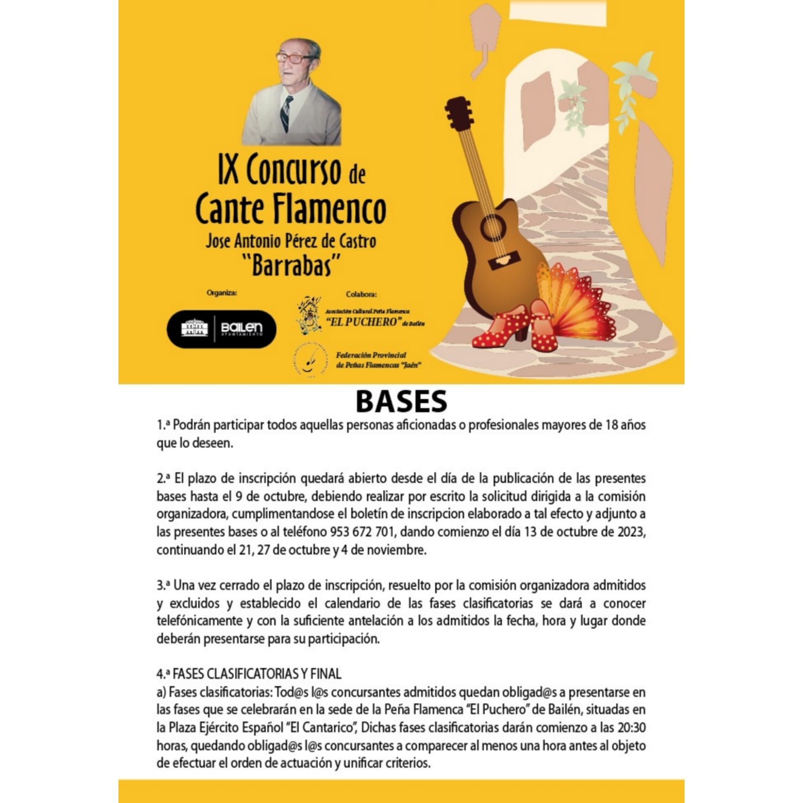 La concejalía de Cultura del Ayuntamiento de Bailén, a cargo de M.ª Teresa Risueño, en colaboración con la Peña Flamenca “El Puchero”, ha convocado el IX Concurso de Cante Flamenco José Antonio Pérez de Castro “Barrabás”, dirigido a cantaores y cantaoras de nuestro país, aficionados y profesionales, mayores de 18 años. La final tendrá lugar el 25 de noviembre en la Casa de la Cultura.