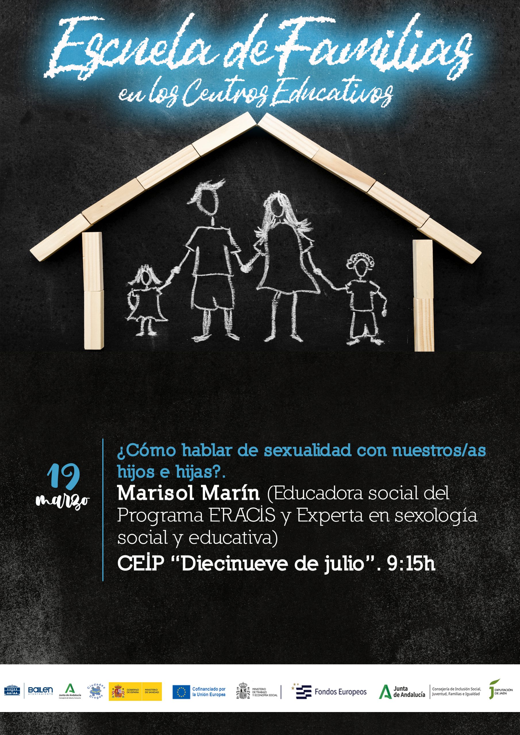 El Ayuntamiento de Bailén organiza a través del Programa ‘Ciudades ante las drogas’ la tercera sesión de la Escuela de Familias prevista para la mañana del 19 de marzo en el CEIP 19 de Julio. La actividad, subvencionada por el Ayuntamiento y la Consejería de Salud y Consumo, con la colaboración de la Diputación de Jaén, está dirigida a los padres y madres de cualquier centro educativo del municipio que estén interesados en cómo educar a sus hijos e hijas en sexualidad.