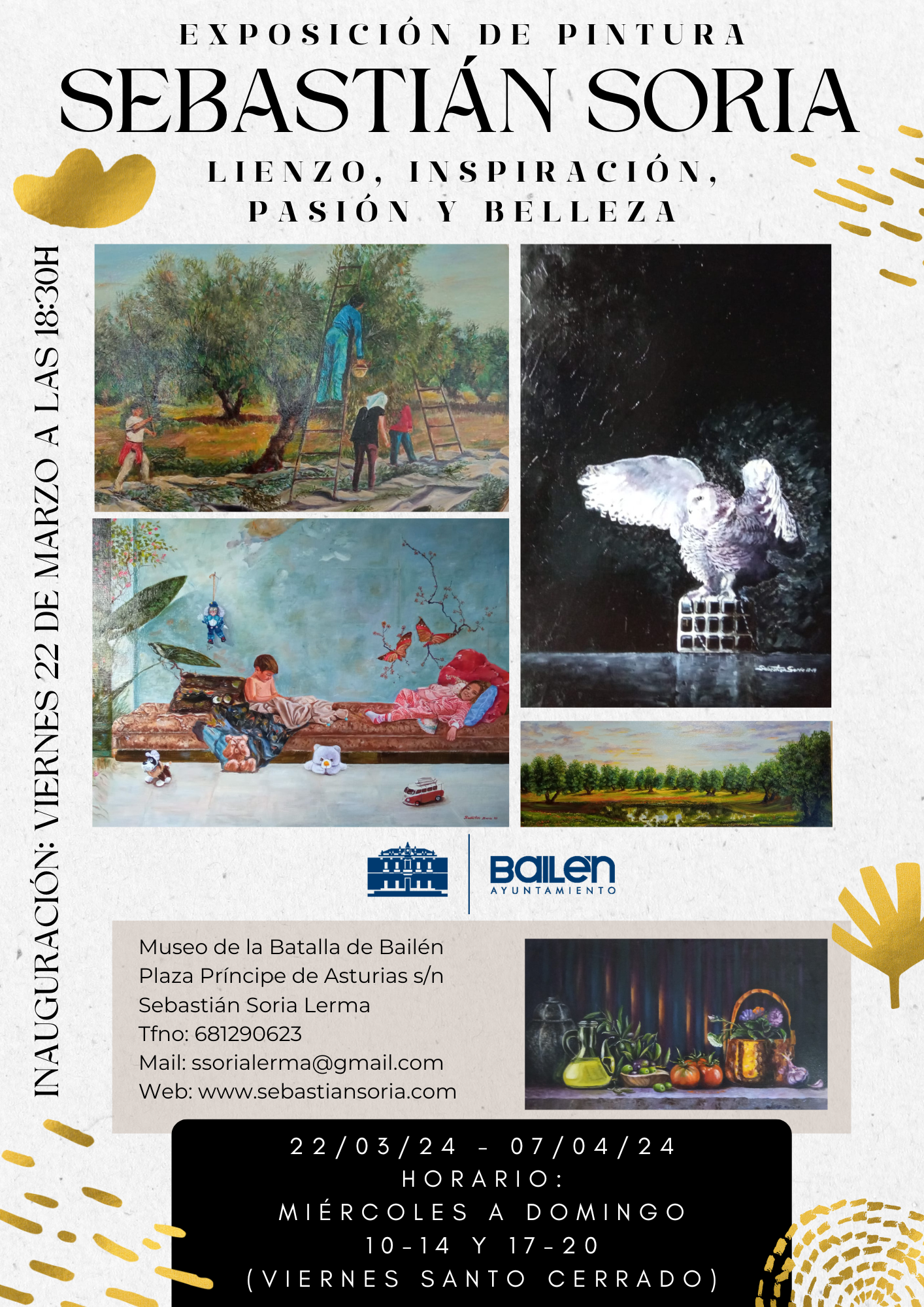 El museo de la Batalla de Bailén acoge la exposición de Sebastián Soria “Lienzo, inspiración, pasión y belleza” que será inaugurada el viernes 22 de marzo a las 18:30 horas. Se podrá disfrutar mañana y tarde de miércoles a domingo, con la excepción del Viernes Santo, día que el museo permanecerá cerrado. Se trata de una muestra organizada por el Ayuntamiento de Bailén.