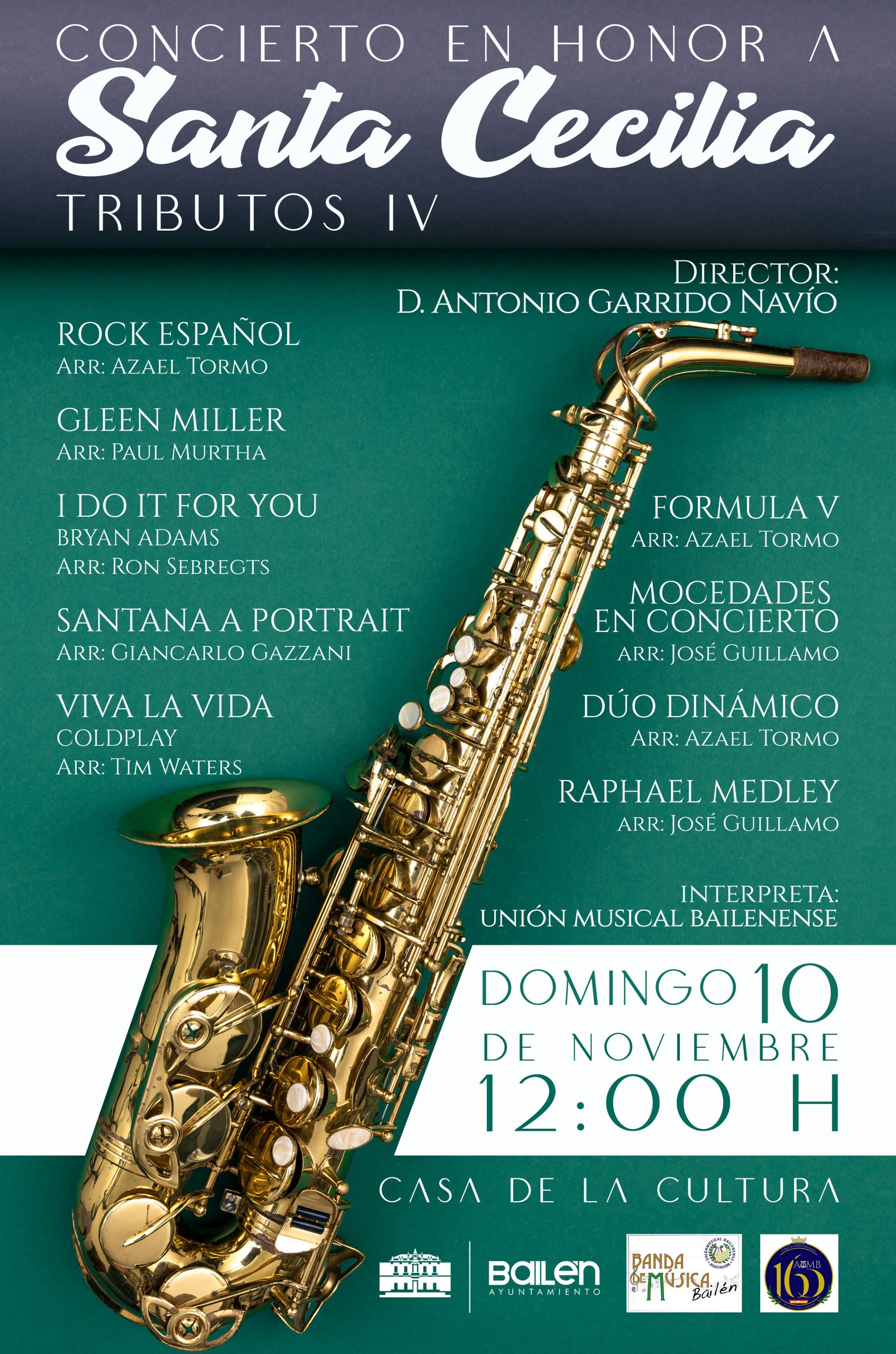 Bajo la dirección de Antonio Garrido Navío, la Unión Musical Bailenense interpretará un magnífico programa bajo el título ‘Tributos IV’ que recogerá rock español; Gleen Miller; I do it for you de Bryan Adams; Santana a Portrait; Viva la Vida de Coldplay; Fórmula V; Mocedades en Concierto; Dúo Dinámico y un medley de Raphael.