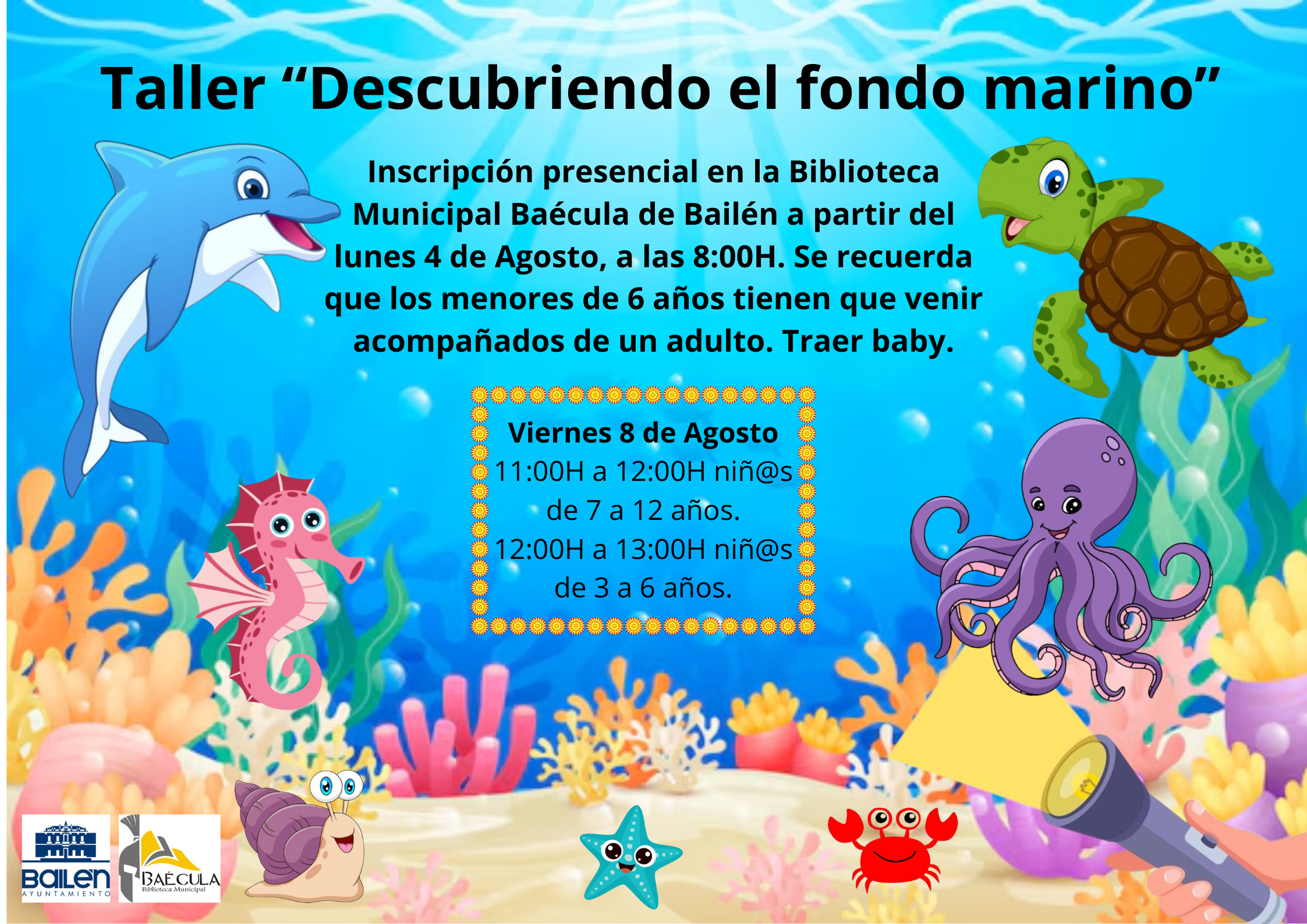 El Taller ‘Descubriendo el fondo marino’ se celebrará el próximo viernes, 8 de agosto, en la Biblioteca Municipal, en horarios diferenciados por grupos de edad. El primero de ellos, de 11.00 a 12.00 horas, para niños de 7 a 12 años; el segundo, de 12.00 a 13.00 horas, para los más pequeños de 3 a 6 años.
