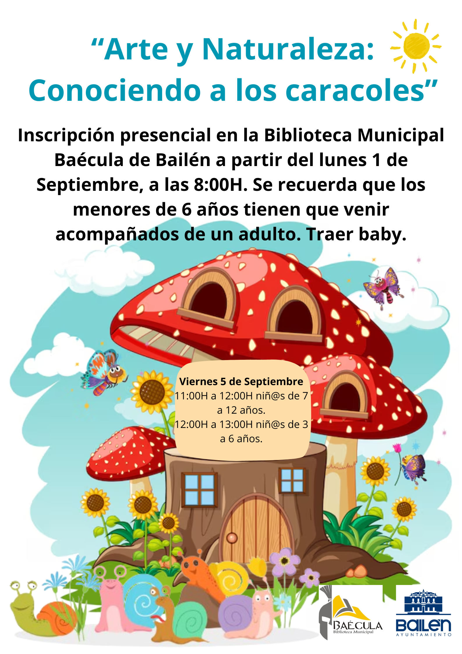 El Taller ‘Arte y Naturaleza: conociendo a los caracoles’ se celebrará el próximo viernes, 5 de septiembre, en la Biblioteca Municipal, en horarios diferenciados por grupos de edad. El primero de ellos, de 11.00 a 12.00 horas, para niños de 7 a 12 años; el segundo, de 12.00 a 13.00 horas, para los más pequeños de 3 a 6 años.