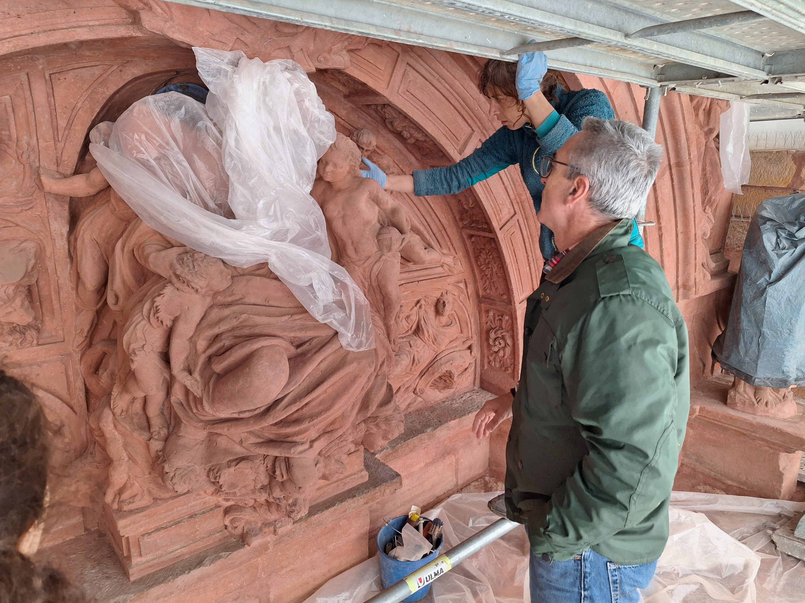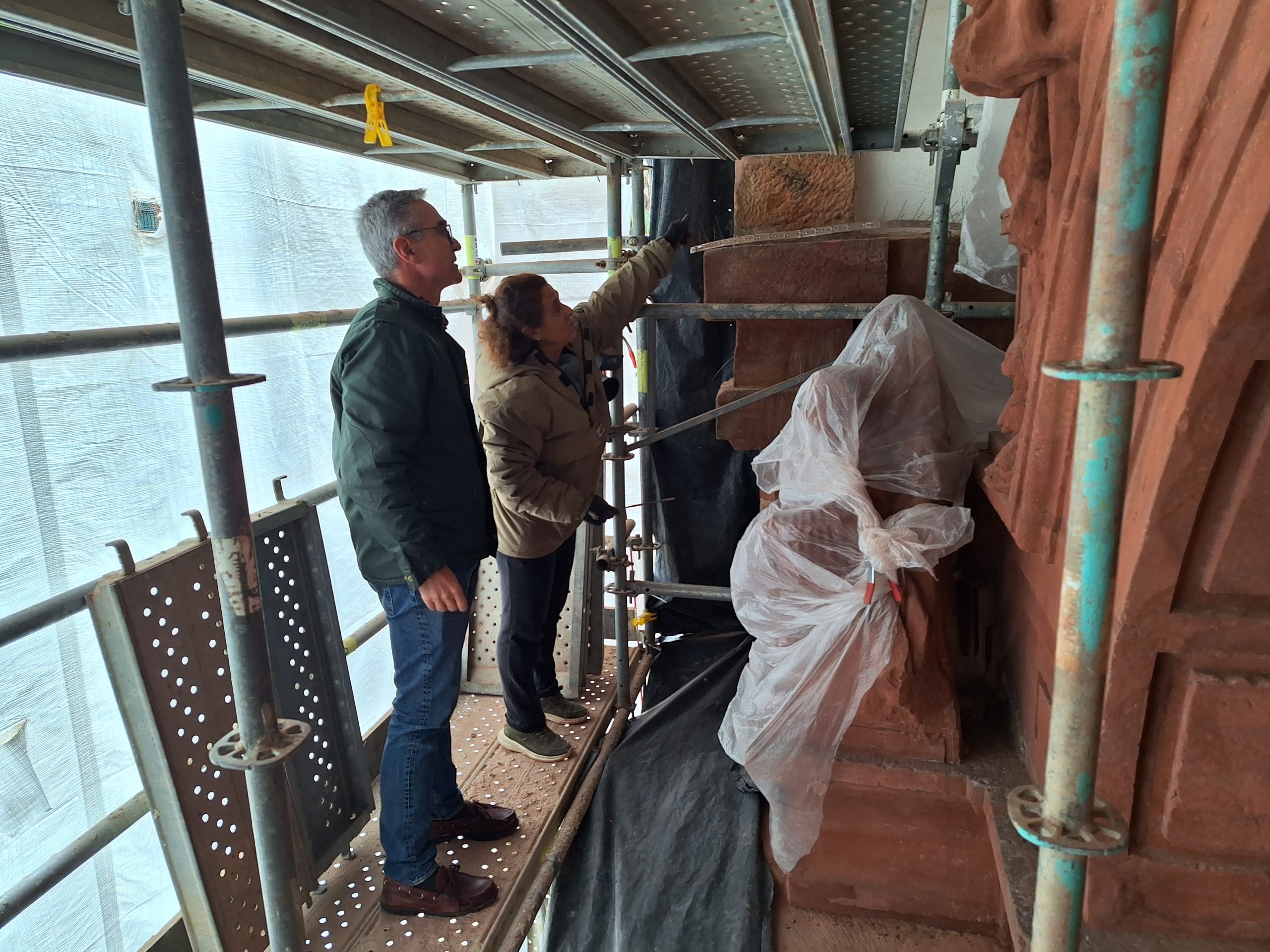 El alcalde de Bailén, Luis Mariano Camacho, ha visitado las obras de restauración y recuperación que se están realizando en el portón y la fachada principal de la Iglesia de la Encarnación desde el pasado mes de noviembre. Unos trabajos que, tal y como ha adelantado el primer edil, “están dando grandes sorpresas” ya que “están apareciendo formas y fechas que podrían hablarnos sobre restauraciones y modificaciones de la portada a finales del siglo XIX”.