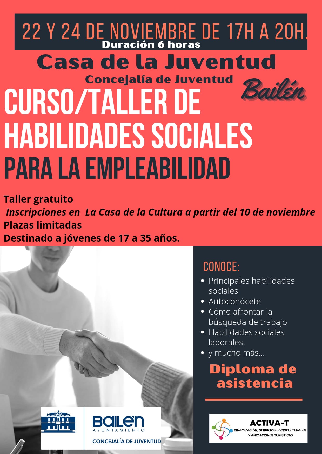 Desde la Concejalía de Juventud, se sigue trabajando para formar a los jóvenes bailenenses y mejorar su empleabilidad mediante la adquisición de técnicas para afrontar en mejores condiciones las entrevistas de trabajo. Con tal motivo se ha proyectado la realización de un curso sobre “Habilidades sociales para la empleabilidad”, que se desarrollará los días 22 y 24 de noviembre, en la Casa de la Juventud.