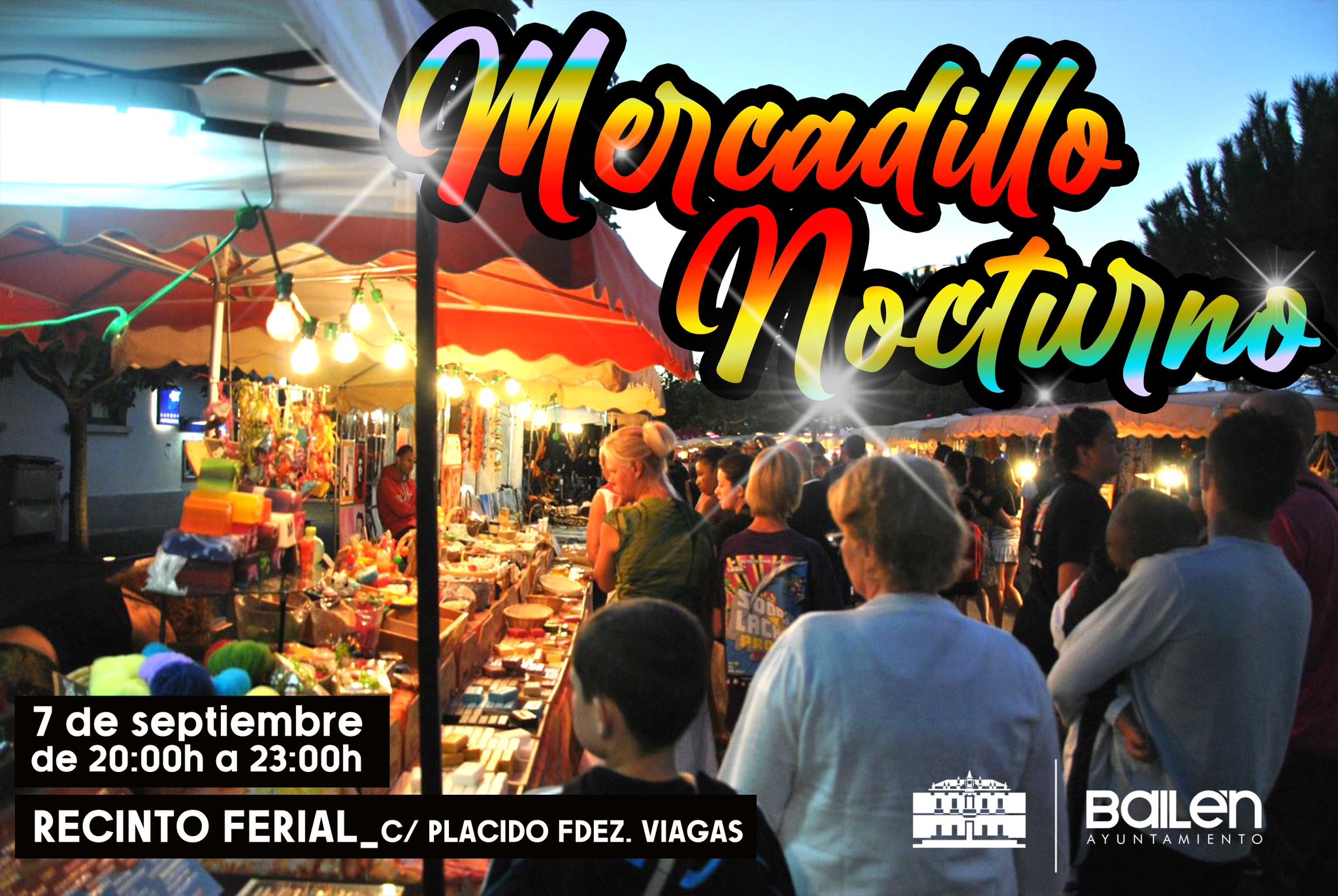 Última jornada del Mercadillo Nocturno el 7 de septiembre de 20:00 a 23:00 horas, en el Recinto Ferial en C/ Plácido Fdez. Viagas. Organiza concejalía de Mercados a cargo de Nieves Rusillo.