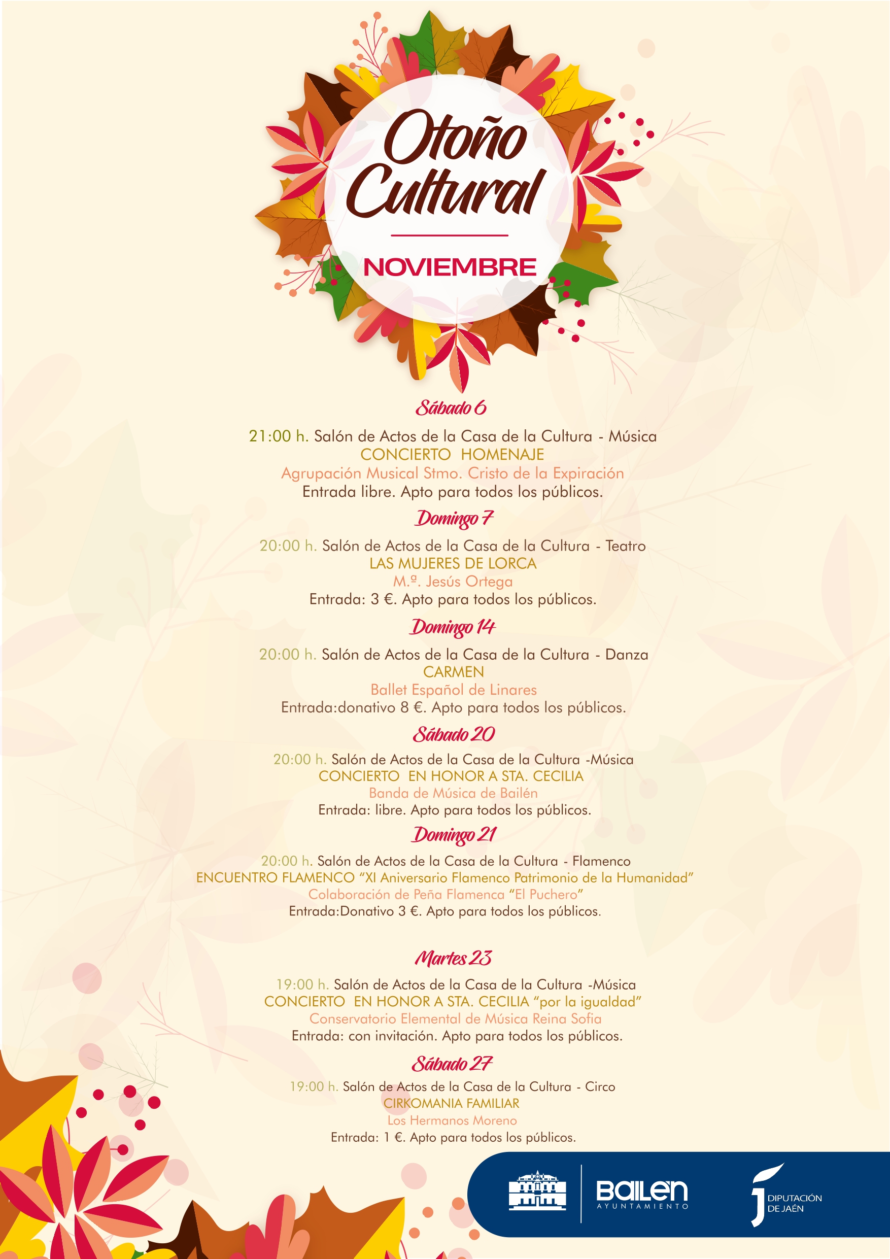 Al Teatro con la compañía Realessa, Danza con el Ballet Español de Linares o el circo de Los Hermanos Moreno, se sumarán las actuaciones de la Banda de Música de Bailén, el Conservatorio de Música Reina Sofía y el encuentro de flamenco “XI Aniversario Flamenco Patrimonio de la Humanidad”.