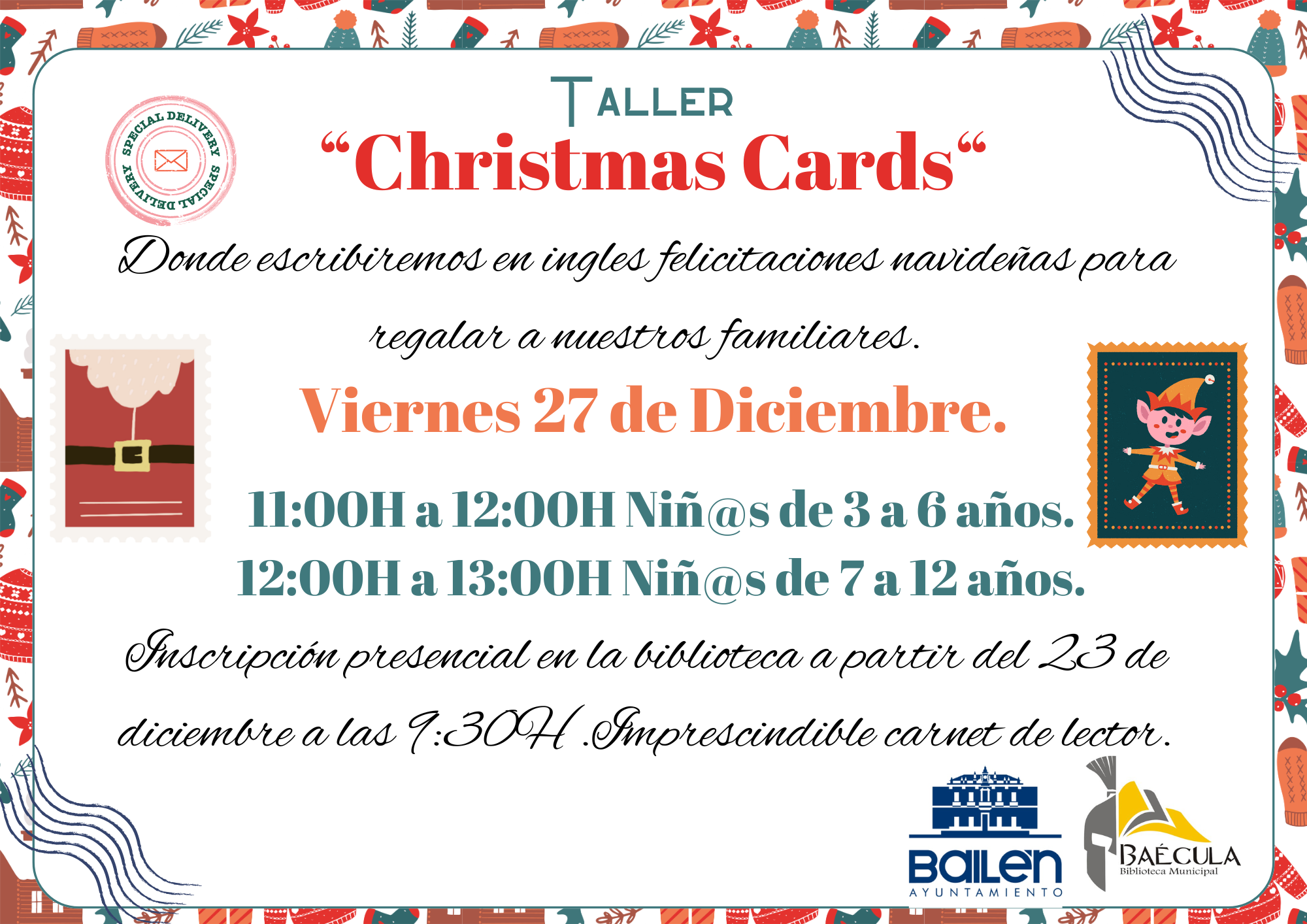 El taller se desarrollará en dos turno; un primero de 11.00 a 12.00 horas destinado a niños de 3 a 6 años y, un segundo, de 12.00 a 13.00 horas para niños de 7 a 12 años. Esta actividad cuenta con aforo limitado por lo que los interesados deberán inscribirse de forma presencial en la Biblioteca Municipal a partir del próximo 23 de diciembre, siendo necesario el carnet de lector.