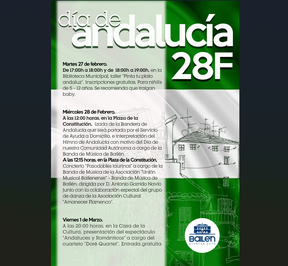 Como novedad, las profesionales del Servicio de Ayuda a Domicilio serán las encargadas de protagonizar la Izada de Bandera que tendrá lugar a las 12:00h. La Banda de Música de Bailén acompañará en esta jornada con el himno de la Comunidad Autónoma. A continuación la banda de música de la Asociación Unión Musical Bailenense ofrecerá un concierto de “pasodobles taurinos”, bajo la dirección de Antonio Garrido con la colaboración del grupo Asociación Cultural “Amanecer Flamenco”.