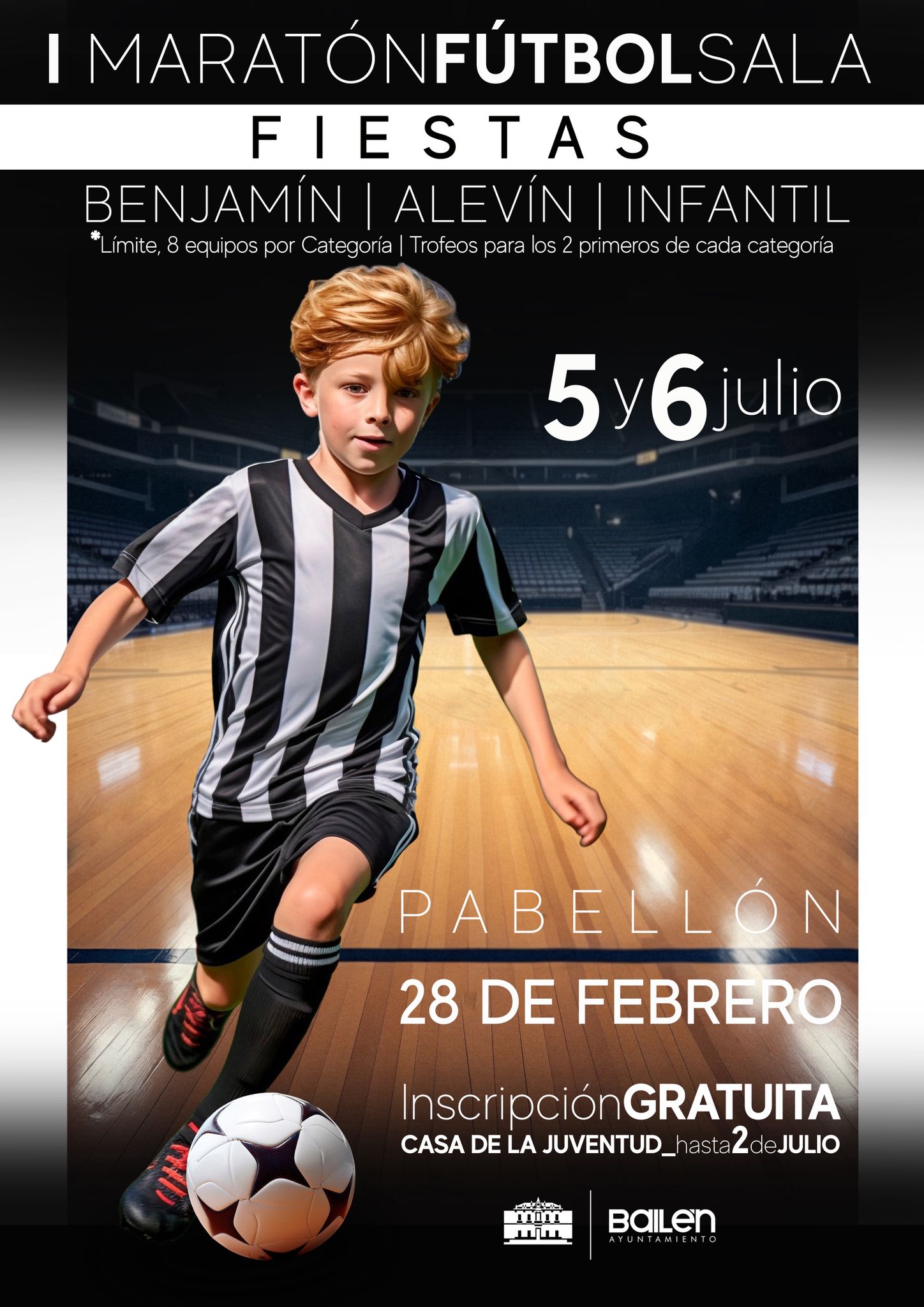 El Área de Deportes del Ayuntamiento de Bailén, bajo la dirección de Manuel Rodríguez, ha anunciado la cuarta actividad deportiva incluida en el programa de las Fiestas Conmemorativas del 217 Aniversario de la Batalla de Bailén. Según ha explicado el edil, “el ‘I Maratón Fútbol Sala’ tendrá lugar los días 5 y 6 de julio en vísperas de nuestras esperadas fiestas”.