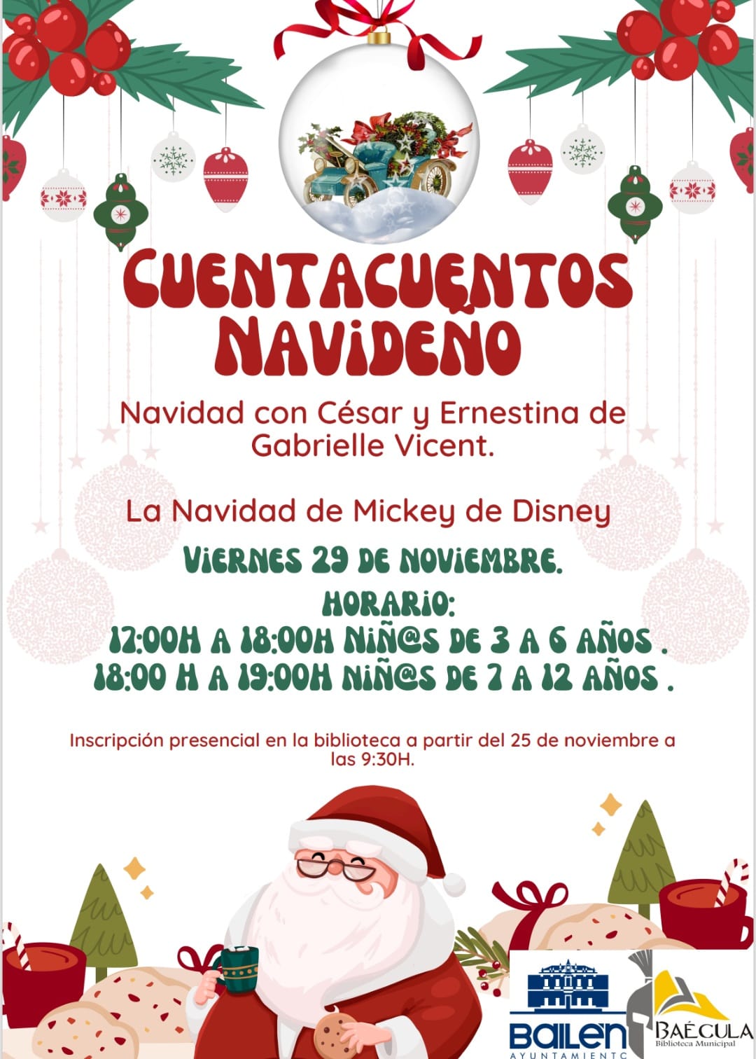 ‘La Navidad de César y Ernestina’, de Gabrielle Vicent, y ‘La Navidad de Mickey de Disney’ serán los dos cuentacuentos de los que podrán disfrutar los más pequeños de la casa en la Biblioteca Municipal y en dos turnos; un primero de 17.00 a 18.00 horas, para niños de 3 a 6 años y un segundo, de 18.00 a 19.00 horas, para niños de 7 a 12 años.