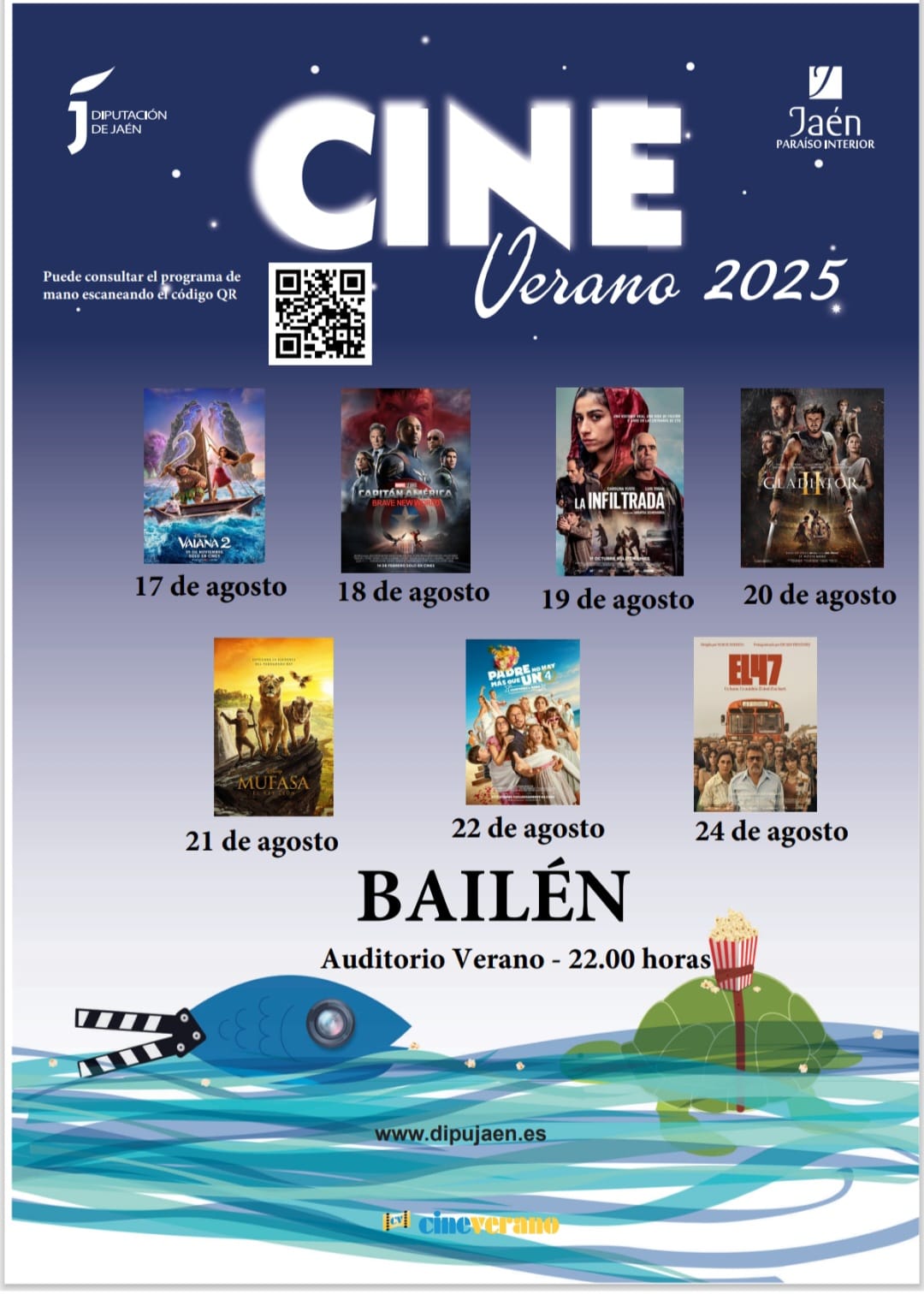 El programa del Cine de Verano de esta edición 2025 contempla hasta siete propuestas. La primera de ellas será ‘Vaina 2’, prevista para el 17 de agosto; ‘Capitán América. Brave New World’ será el film que protagonizará la noche del día 18; ‘La infiltrada’ se proyectará el 19 de agosto; para el día 20, los amantes del cine tendrán una cita con ‘Gladiator II’; ‘Mufasa’ será la película de la que podrán disfrutar los bailenenses el día 21; la exitosa ‘Padre no hay más que uno’ 4 se proyectará el 22 de agosto y, finalmente, ‘El 47’ será el título que cerrará esta edición en la noche del 24 de agosto.