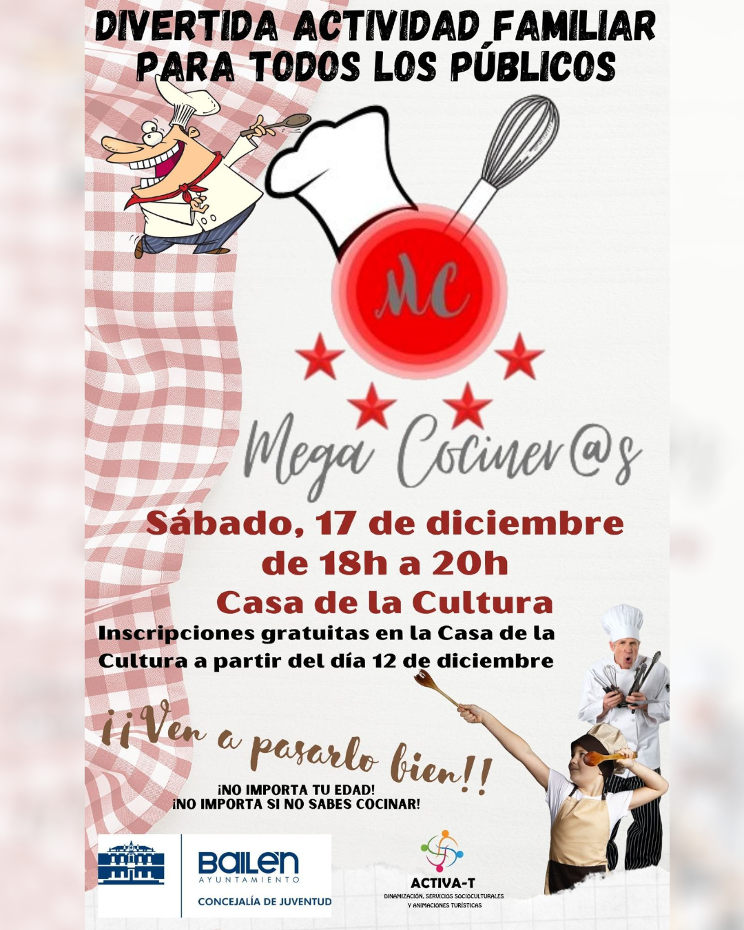 Para el sábado se ha preparado una divertida actividad para toda la familia. “Megacocineros” convoca a todos los miembros de la familia que tengan ganas de pasarlo bien, sin que importe que tengan conocimientos de cocina. La actividad se realizará el sábado 17 de 18.00 a 20.00 horas en la Casa de la Cultura. La inscripción a este taller se encuentra abierta desde el día 12 de diciembre.
