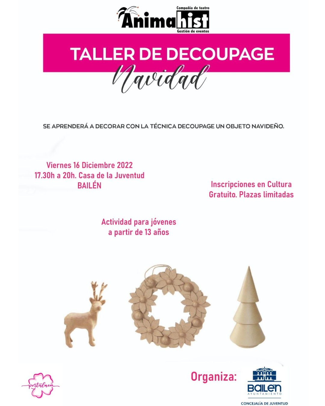 En primer lugar, el viernes 16 de diciembre se va a celebrar un taller de Decoupage, técnica que consiste en decorar superficies (de todo tipo, desde céramica, madera, cartón e incluso jabones o velas) con imágenes de papel o de tela recortadas y que son fijadas a la superficie que se quiera decorar con un barniz. Esta actividad, que se celebrará de 17.30 a 20.00 horas, va dirigida a jóvenes mayores de 13 años, pudiéndose realizar la inscripción previa en la Casa de la Cultura.