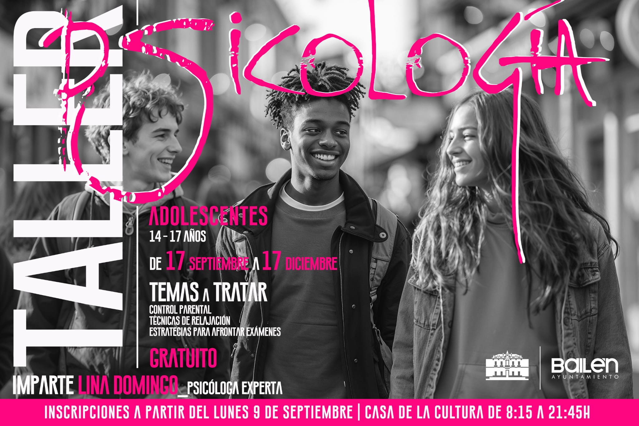 La concejalía de Juventud del ayuntamiento de Bailén que dirige Lorena Linares ha organizado dos talleres de Psicología destinados a jóvenes y adolescentes que impartirá la Psicóloga Lina Domingo.