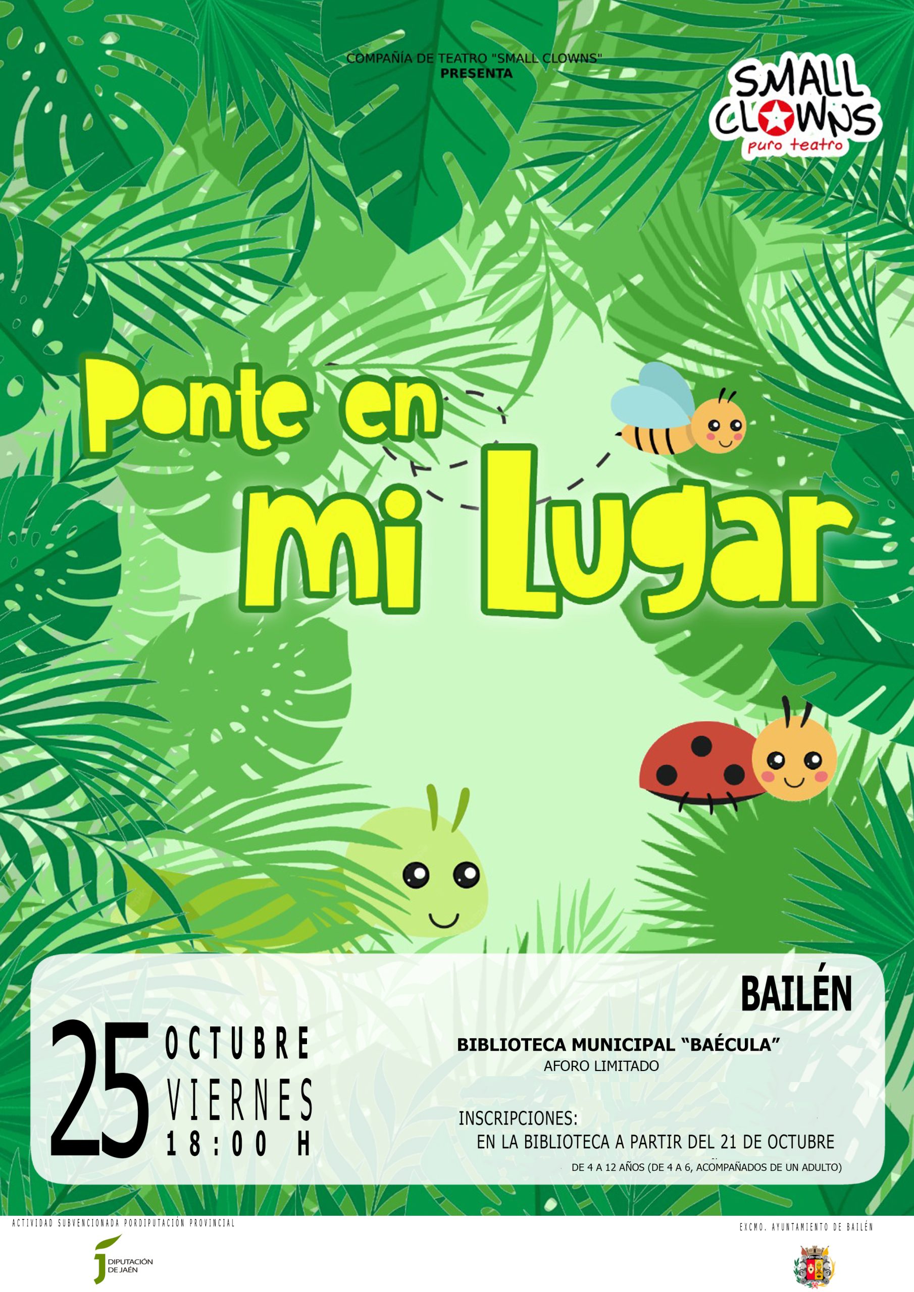 El próximo viernes, 25 de octubre, con motivo del Día de las Bibliotecas, la Concejalía de Cultura, dirigida por María Teresa Risueño, ha organizado una representación teatral para el público infantil. Se trata de la obra ‘Ponte en mi lugar’, que será puesta en escena por la compañía ‘Small Clowns’ en las instalaciones de la Biblioteca Municipal de Bailén.