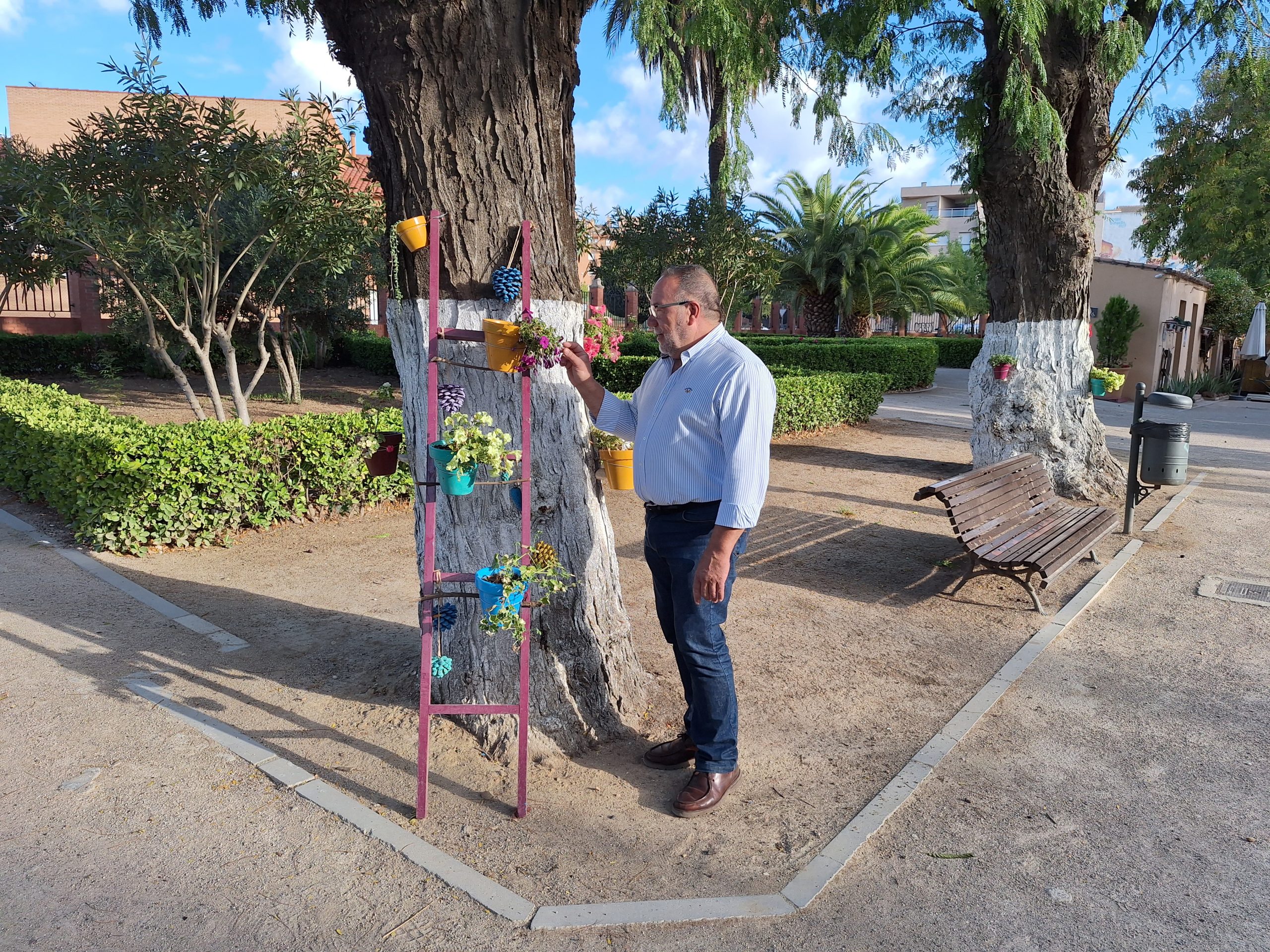 Del mismo modo, se ha procedido a la pintura de la base de los árboles en color blanco y azul, adornados también con coronas de macetas de geranios pintadas a mano que rodean el tronco. El aprovechamiento de los recursos ha permitido, incluso, la creación de un bonito bodegón, poniendo en valor un árbol talado con elementos como una escalera de madera y un jarrón, hasta convertirlo en una estructura que encaja y embellece el entorno.