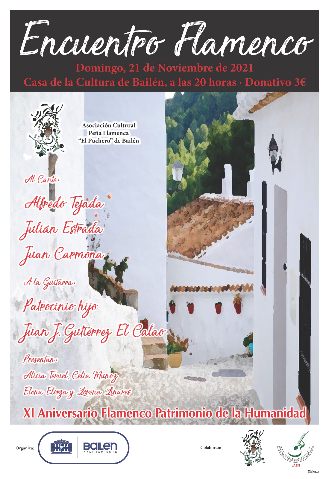 Actuarán sobre las tablas del escenario de la Casa de la Cultura al cante Alfredo Tejada, ganador de la “Lámpara Minera 2017”, ha viajado por medio mundo formando parte de importantes espectáculos de flamenco y ha ganado el pasado año el Premio al Mejor Cantaor de Acompañamiento del Festival de Jerez; Julián Estrada, ganador de más de 30 primeros premios en otros tantos festivales de toda España, ha publicado también 6 discos de flamenco y 1 de saetas; y el bailenense Juan Carmona, joven valor de nuestro pueblo que ha conseguido llevarse varios primeros premios en distintos concursos de nuestra comunidad autónoma, como el de las Minas de La Carolina o el Juan Antonio Pérez de Castro “Barrabás”.