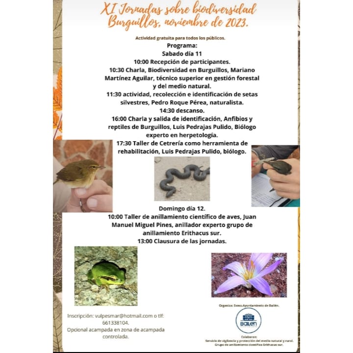 El próximo fin de semana se celebrarán en Burguillos las XI Jornadas de Biodiversidad organizadas por la concejalía de Medio Ambiente, a cargo de María Teresa Risueño con la colaboración del Servicio de vigilancia y protección del medio natural y rural, y el grupo de anillamiento Erithacus Sur. Las jornadas se enmarcan dentro de Plan de dinamización de Burguillos con el objetivo de dar a conocer la flora y fauna de la dehesa.