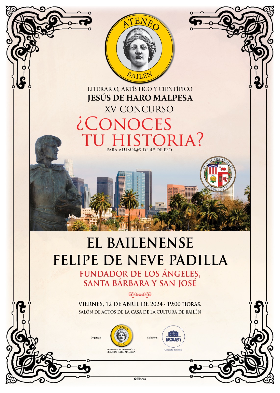 Han confirmado su participación tres equipos – uno de cada Centro Educativo de la ESO- que contestarán a las preguntas sobre el tema de esta edición: El Bailenense Felipe de Neve Fundador de la ciudad de los Ángeles, Santa Bárbara y San José.