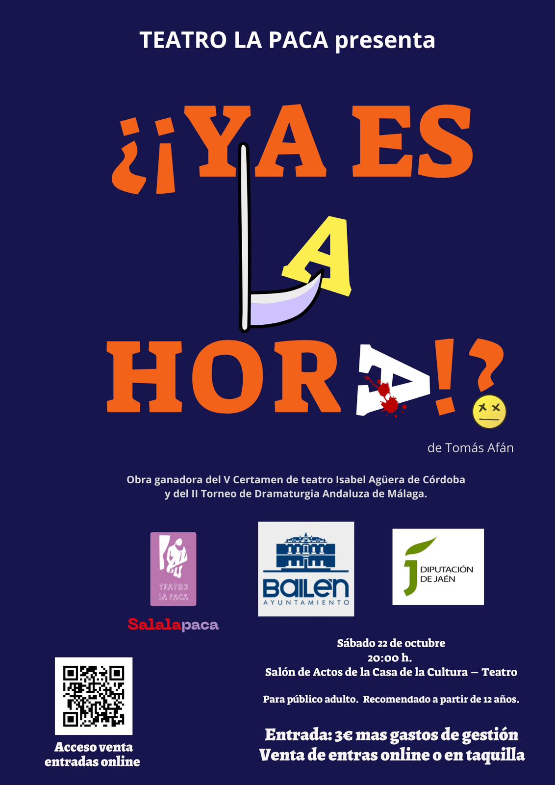 La Compañía de Teatro “La Paca”, de Jaén, pone en escena en la Casa de la Cultura el próximo sábado la obra “¿¡Ya es la hora!?”, una obra original del dramaturgo de la compañía, Tomás Afán, que con este texto ha conseguido dos prestigiosos premios: el V Certamen Nacional de las Letras Ciudad de Villa del Río, y el II Torneo de Dramaturgia Andaluza.