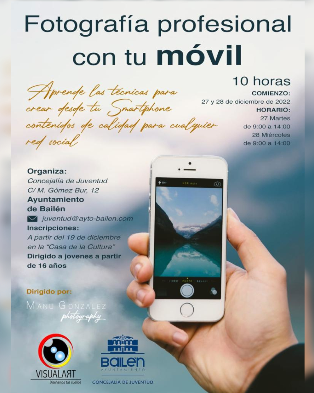 La Concejalía de Juventud ha puesto en marcha un curso de fotografía profesional a través del móvil. El objetivo con el que se plantea esta actividad formativa es conseguir que los jóvenes bailenenses puedan formarse en el ámbito de las nuevas tecnologías, al tiempo que adquieren herramientas que pueden ayudarles en la búsqueda de empleo en el futuro.